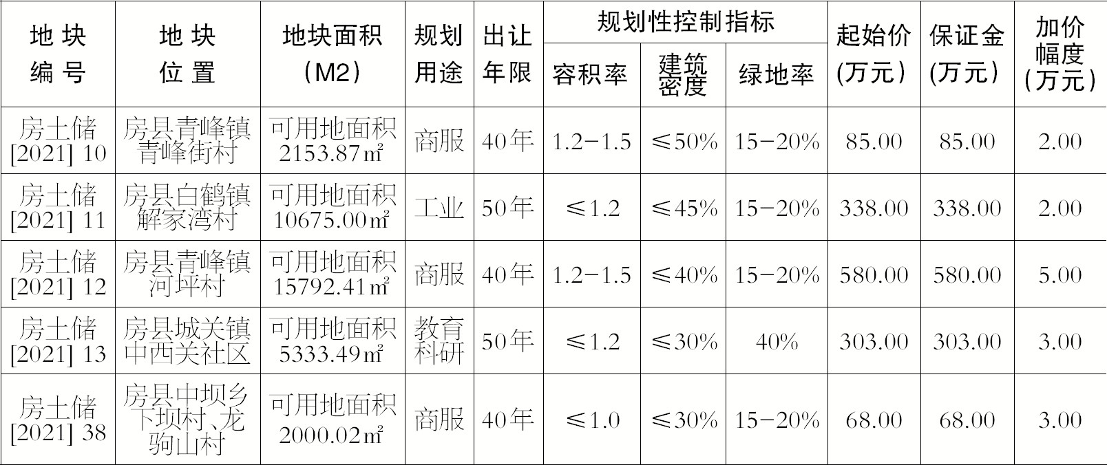 2、本次出让的宗地以现状条件出让,房土储〔2021〕10、12号宗地由房县青峰镇人民政府负责交地;房土储〔2021〕11号宗地由房县白鹤镇人民政府负责交地;房土储〔2021〕13号宗地由房县城关镇人民政府负责交地;房土储〔2021〕38号宗地由房县中坝乡人民政府负责交地。