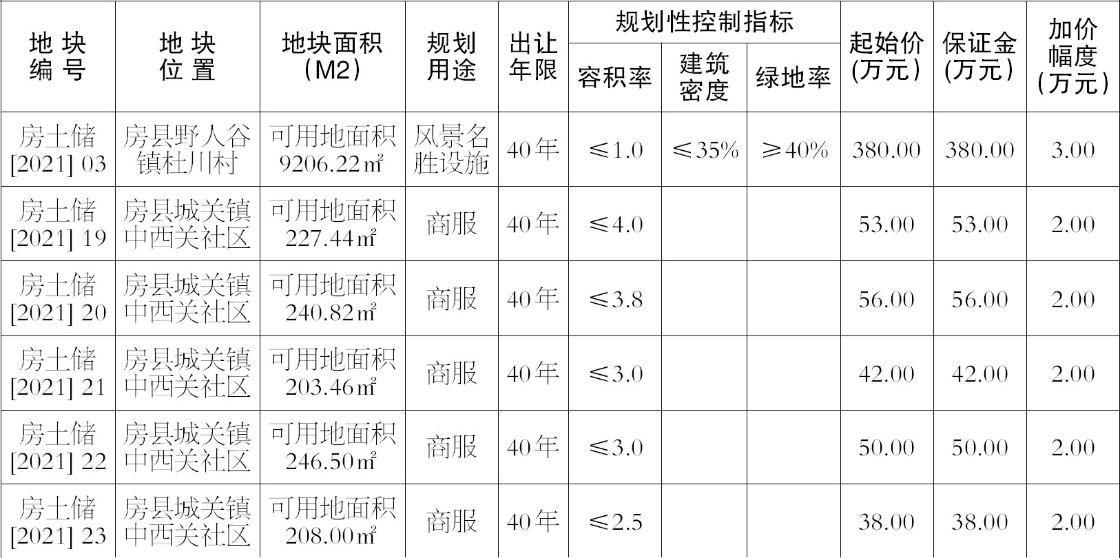 3、本次出让的房土储〔2021〕19号宗地,注册成立公司的经营范围应包括住宿与餐饮服务、酒店与物业管理、会议及展览服务、组织文化艺术交流活动、教育咨询服务等。房土储〔2021〕20号宗地,注册成立公司的经营范围应包括组织文化艺术交流活动、文艺创作等。房土储〔2021〕21号宗地,注册成立公司的经营范围应包括住宅室内装修、规划设计管理、建筑材料销售、轻质建筑材料销售等。房土储〔2021〕22号宗地,注册成立公司的经营范围应包括艺术交流活动、展览展示策划、民宿服务等。房土储〔2021〕23号宗地,注册成立公司的经营范围应包括住宿与餐饮服务、住宅室内装饰装修、安全技术防范系统设计施工服务、规划设计管理、文艺创作、组织文化艺术交流活动等。