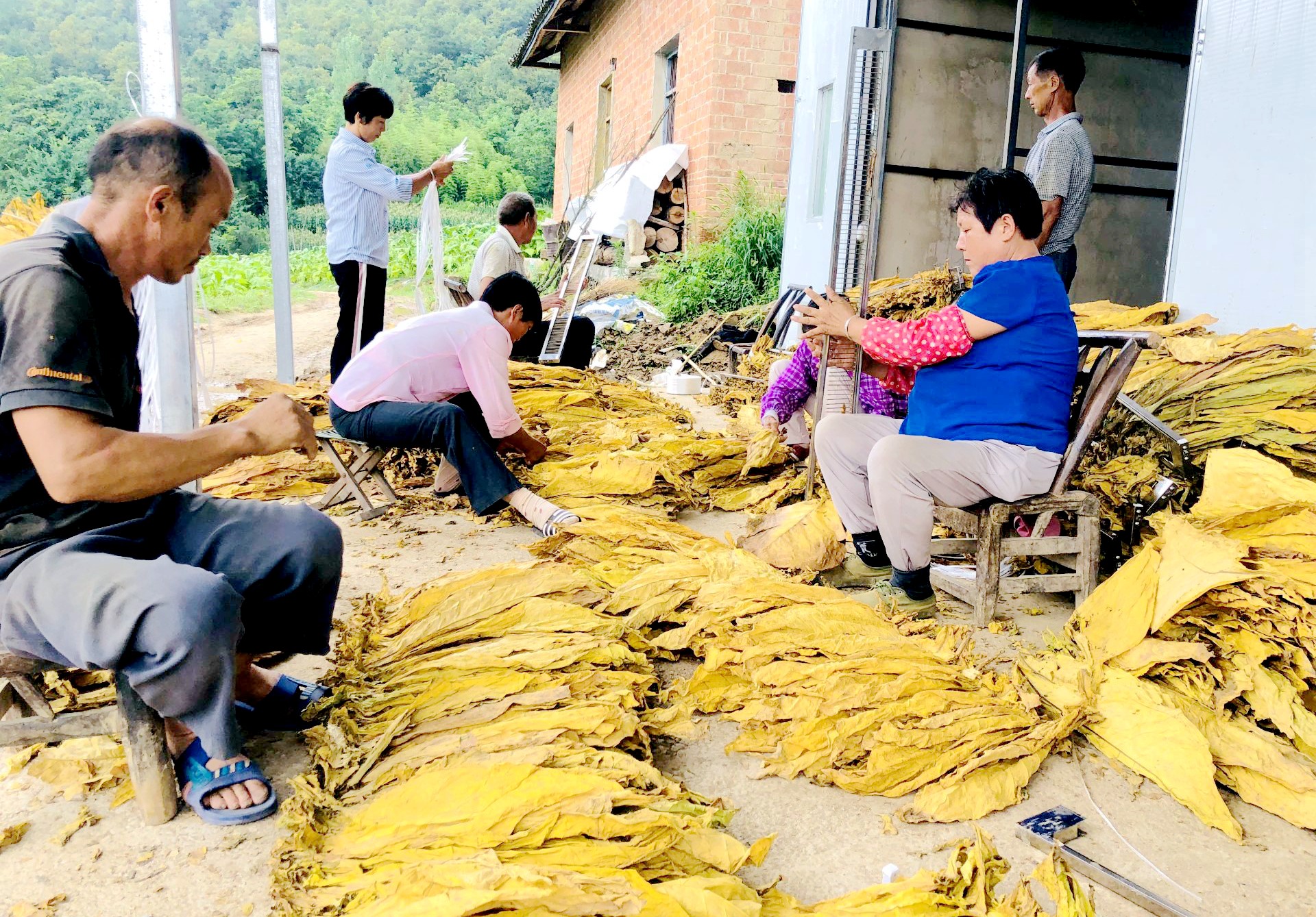 近日,青峰镇龙王坪村烟农正在分拣烘烤的烟叶。时下正值烟叶采收烘烤期,龙王坪村烟叶种植基地迎来丰收,烟农们抢抓晴好天气适时采收、编杆、烘烤、分拣。多年来,该镇一直将烤烟作为带动群众增收致富的主要产业,通过技术指导、资金扶持等举措,全方位促进烤烟提质增效。(绳晓 摄)