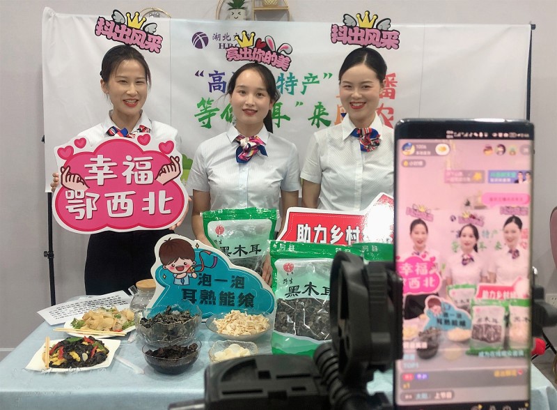近日,湖北交投鄂西北高速公路运营管理有限公司收费员在公益直播间里向网友们推荐房县黑木耳,帮助土城镇通省、葛坪村种植户销售土特产。为了帮助偏远山区百姓疏通土特产畅销路,该公司组建“志愿助农”小分队,充分利用业余时间开展网上公益直播活动,让山区百姓足不出户就可以卖出农产品。(金伟忠 王巧 摄)
