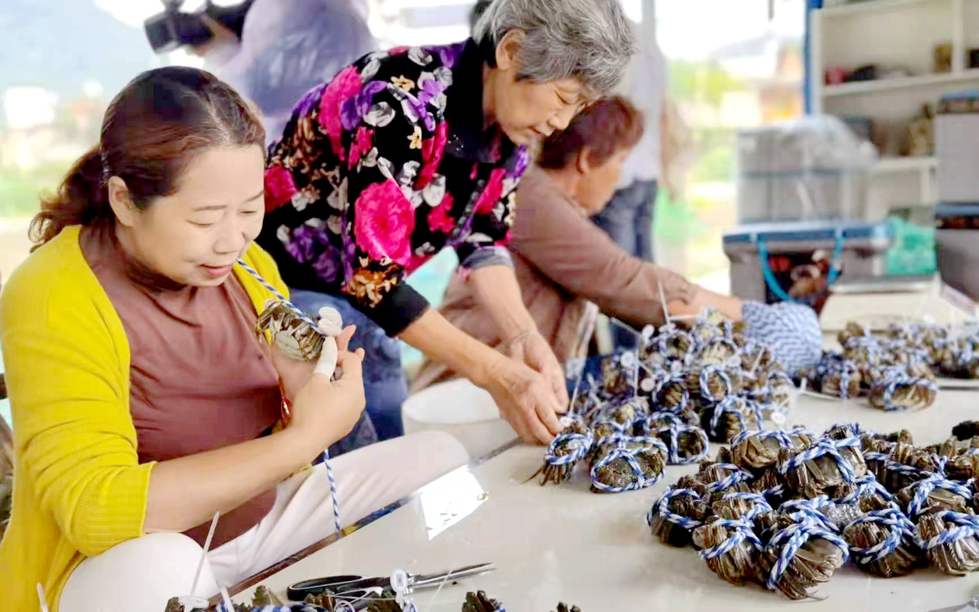 近日,红塔镇党家湾村螃蟹养殖基地的螃蟹喜获丰收,工作人员们正忙着给刚打捞上来的螃蟹绑绳、贴“身份证”、装箱。据苏陵水产养殖专业合作社负责人介绍,今年该基地螃蟹个头大、长势良好,预计总产量在3万斤左右。(林敏 摄)