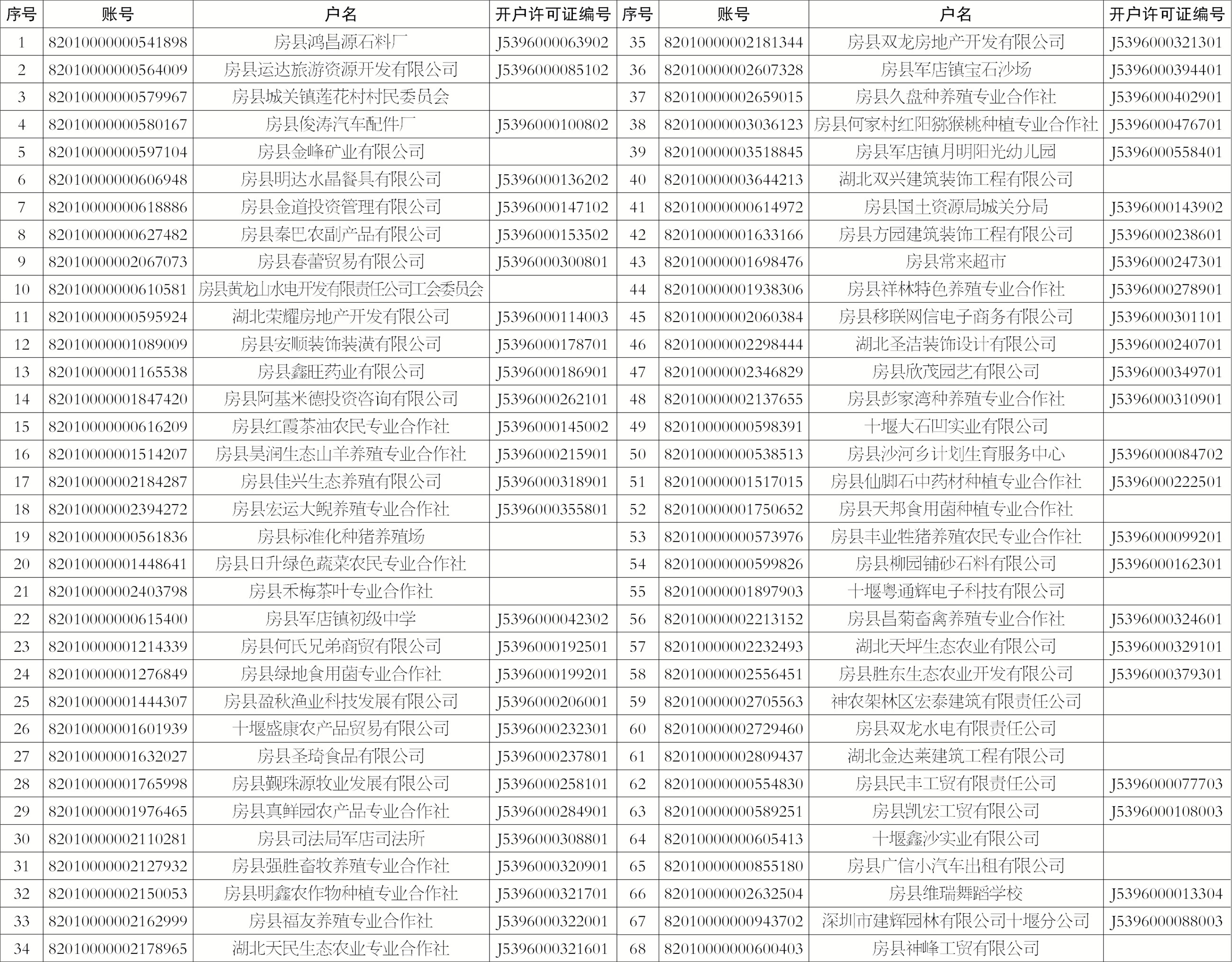 为规范人民币结算账户使用,加强银行结算账户管理,根据中国人民银行《人民币银行结算账户管理办法》(中国人民银行令2003第5号)第五十六条规定,房县农商银行对辖内所有网点开立的单位结算账户进行了清理,清理一批长期不动户,共68户(见清单),经逐户核实,因销户资料不齐全、开户许可证遗失等原因一直未在人民币结算账户管理系统撤销,现公示账户68户。请下列单位自本公告发布之日起30日内到开户银行办理销户手续、交回开户许可证原件,逾期视同自愿销户,我行将作销户处理。同时单位银行结算账户对应的开户许可证作废,由此产生的纠纷由账户持有单位自行承担。