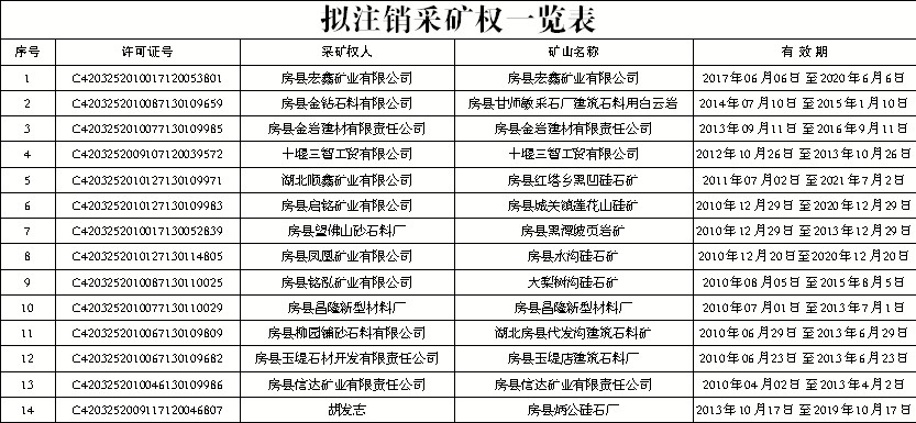 房县自然资源和规划局按照《全市矿山清理修复“秋季攻坚”专项行动工作方案》部署,决定注销以下14家县级发证过期采矿权,请相关矿业权人在公告发布15日内前来办理申请注销手续。对逾期未申请办理的,房县自然资源规划局将直接注销清库。