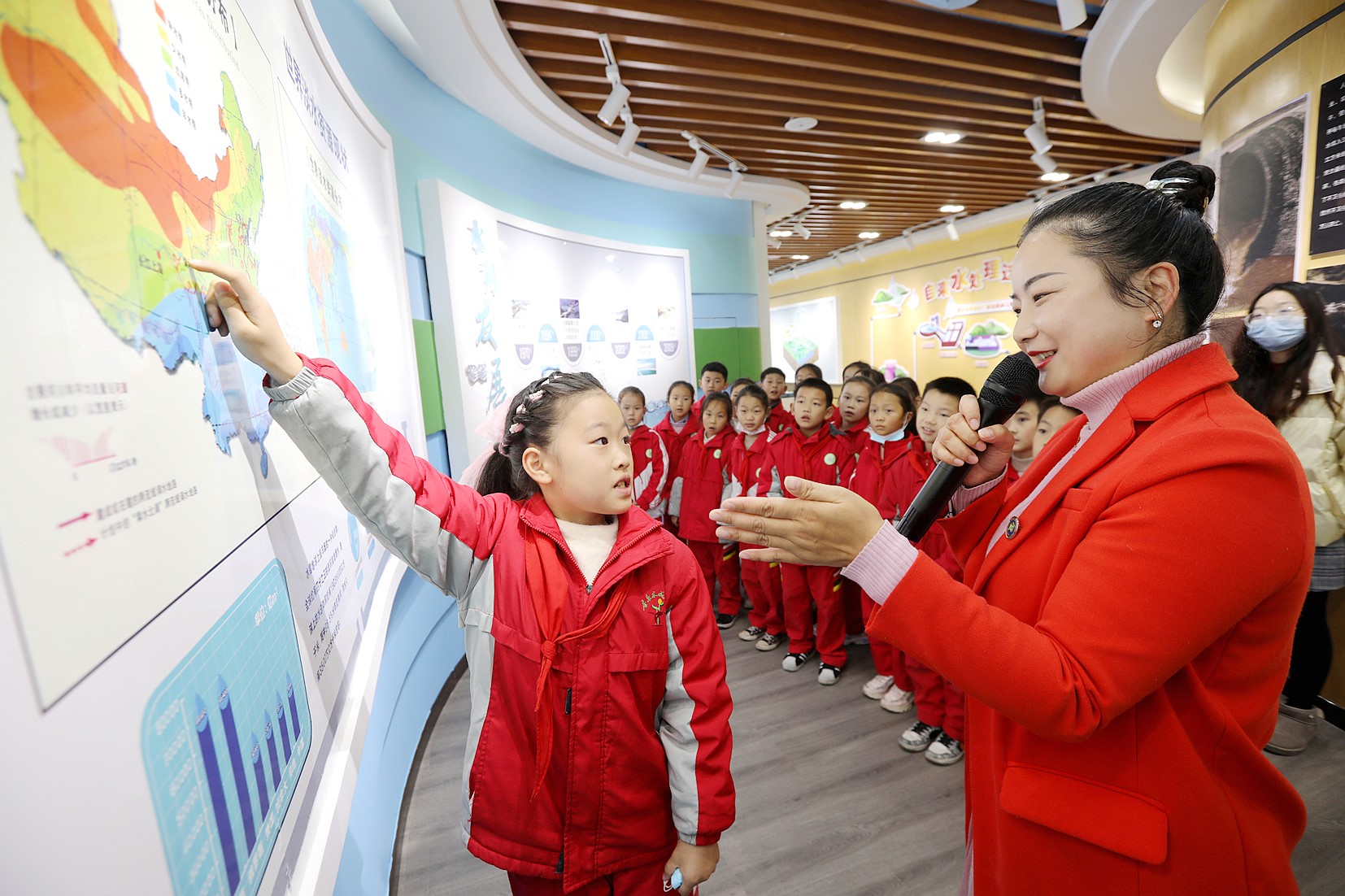 近日,县东城小学节水护水讲解员在为学生讲解节水知识,这是县水利和湖泊局在东城小学建成的节水教育基地,该基地已接纳3000余学生参观学习,学生们通过听宣传、看展板,亲身体验节水新工艺和新技术,进一步提升“节水、爱水、惜水”意识。(张启龙 马金恕 摄)