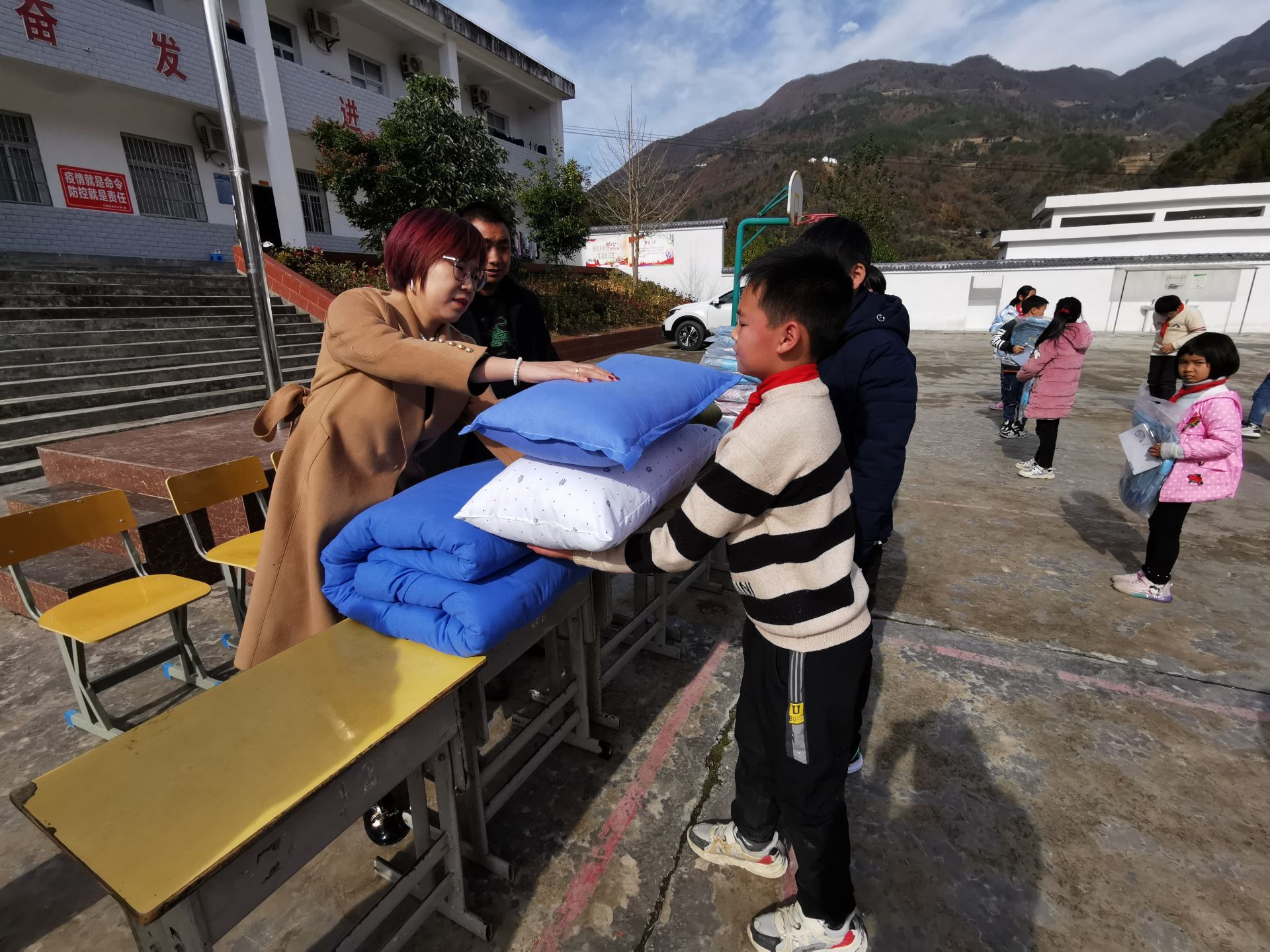 11月22日,北京益泰牡丹电子工程有限公司爱心人士来到九道乡关坪小学开展助学捐赠活动。活动中,爱心人士将45套棉被和70个书包有序发放给学生,孩子们看着手中的书包,脸上洋溢着幸福的笑容。(余霞 裴欢 摄)
