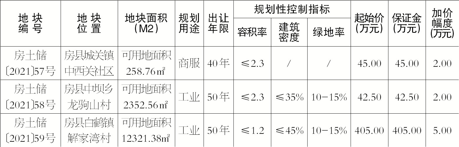 4、本次出让的宗地以现状条件出让,房土储〔2021〕57号宗地由房县西关片区棚户区改造指挥部负责交地;房土储〔2021〕58号宗地由房县中坝乡人民政府负责交地;房土储〔2021〕59号宗地由房县工业园区管理委员会负责交地。