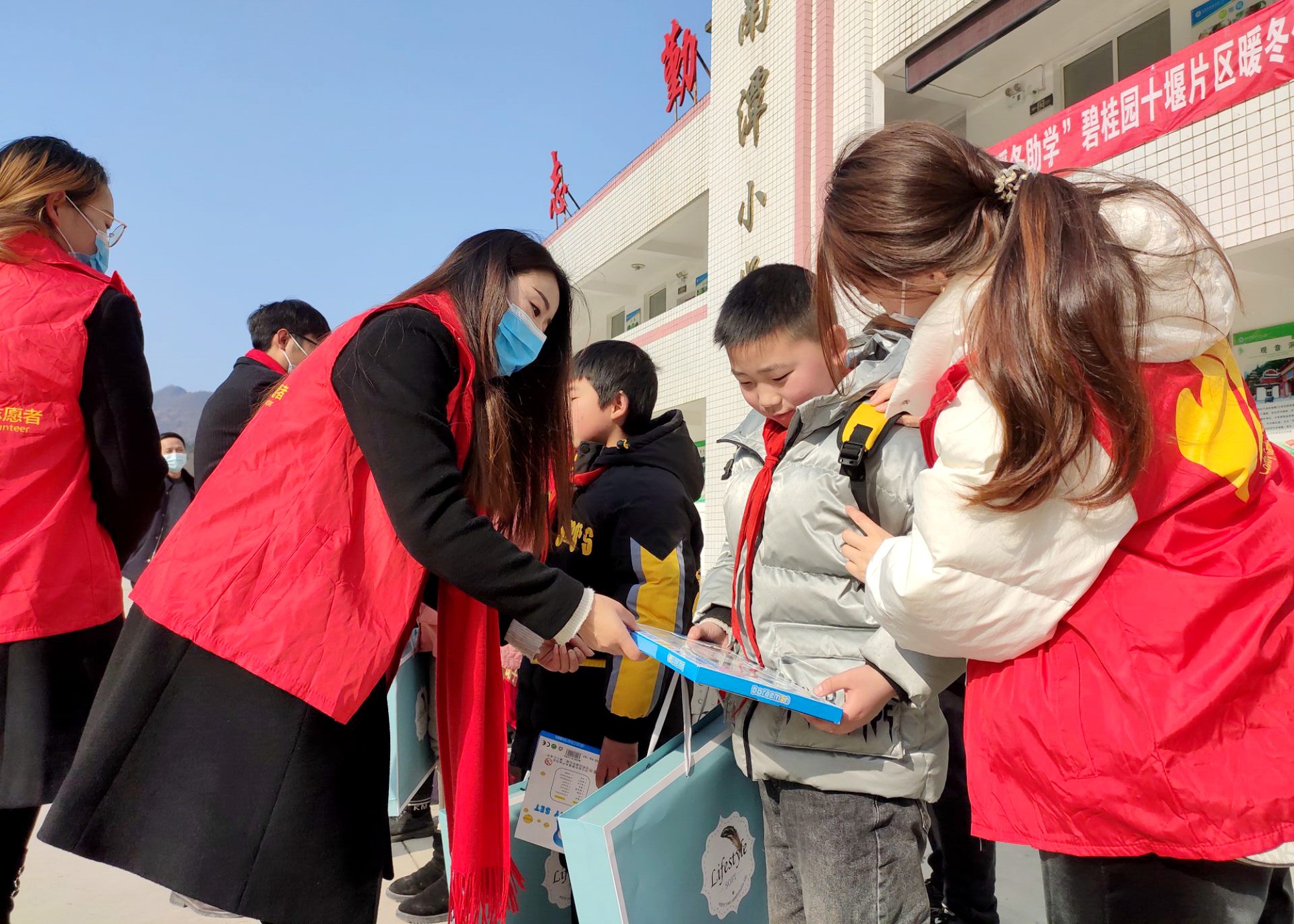 近日,十堰碧桂园集团的志愿者来到红塔镇南潭小学,开展以“爱心筑梦 暖冬助学”为主题的公益捐赠活动,为该校师生送去书包、练习册、文具、羽毛球拍等价值15000元的爱心助学大礼包。(何赛男 彭申奥 摄)