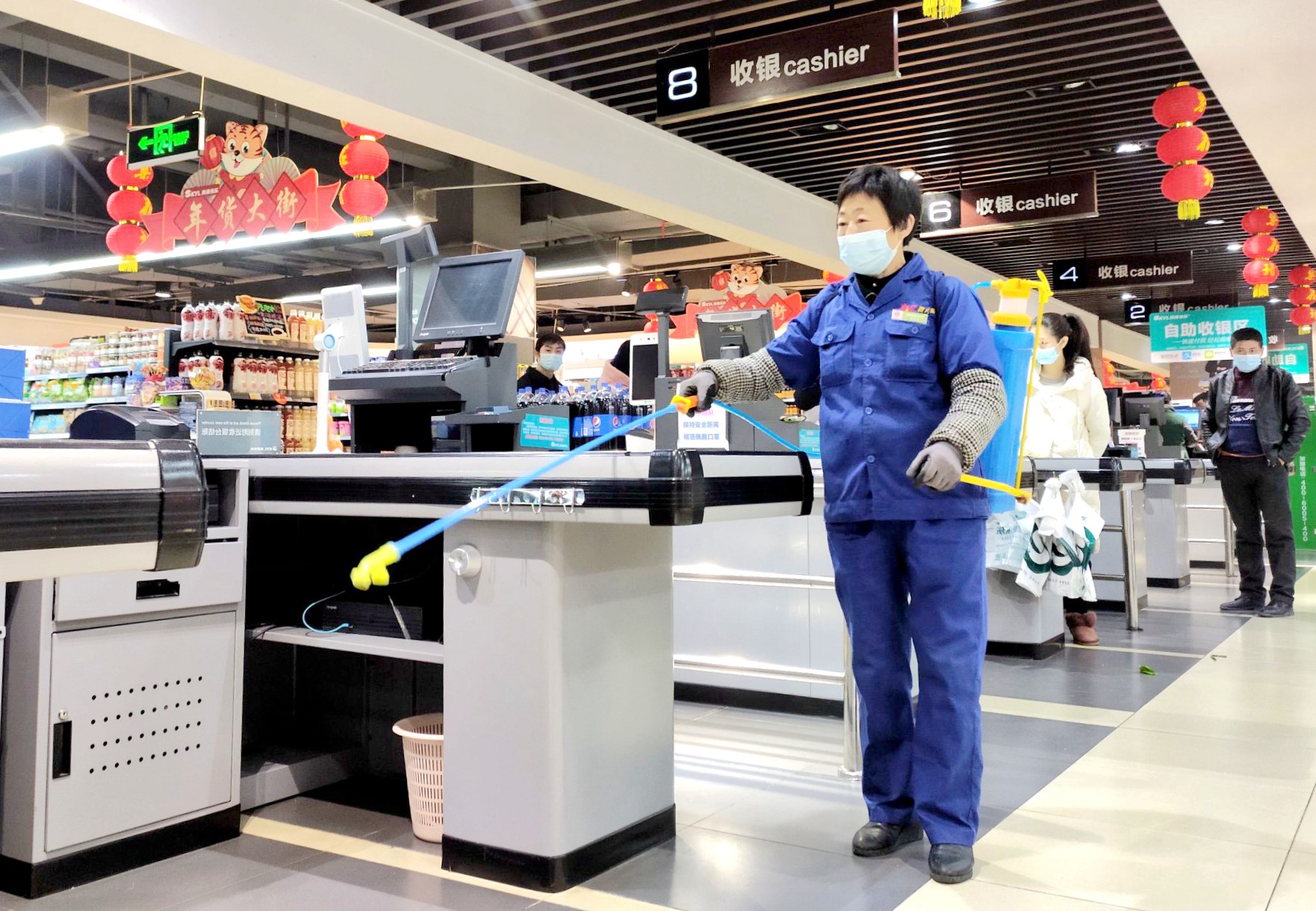 1月19日,寿康永乐生活广场工作人员正在对超市公共区域进行消杀。春节临近,各大商场超市纷纷迎来购物热潮。面对当前依然严峻的疫情防控形势,各超市严格落实查“两码”、测体温、控流量、一米线等防控措施,积极营造安全放心的购物环境。(宋钱 摄)