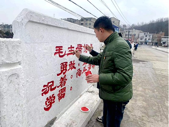 近日,军店镇组织年轻干部在军店大桥开展红色经典描红活动,推动党史学习教育持续走深走实。该桥始建于1969年,桥栏镌刻的红色经典因历时久远,现已字迹模糊、难以辨认。活动中,年轻干部先仔细清理桥栏凹痕中的灰层,再用毛笔进行描红,以此来缅怀革命先烈,延续和传承红色血脉。(张超群 摄)