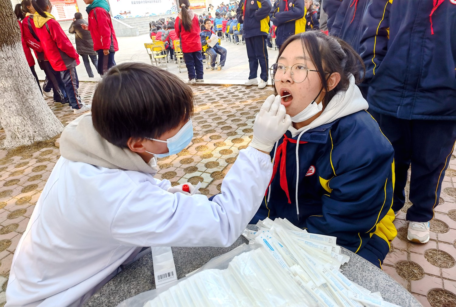 近日,县实验中学积极对接县中医院,有序对该校师生开展核酸抽检工作。此次核酸抽检人数按10%的比例在各班随机抽取,学生们按照要求,有序参与核酸检测,医护人员逐个为学生采集咽拭子。此次抽检,为该校的教学工作提供安全保障,进一步巩固学校的疫情防线。 (陈凡 摄)