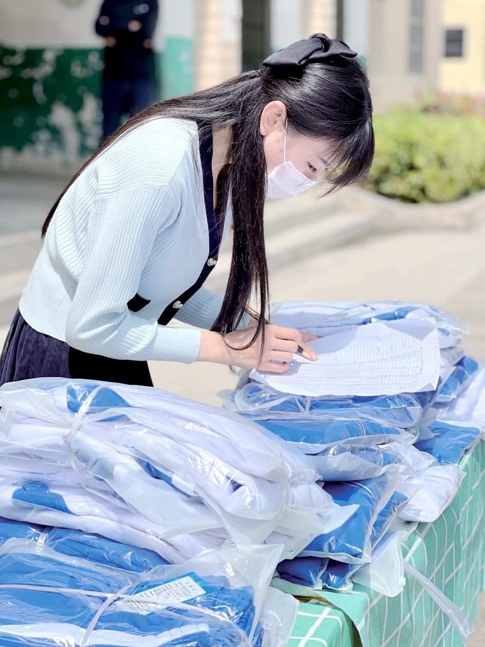 胡媛仔细核对学生的姓名和对应的尺寸。
