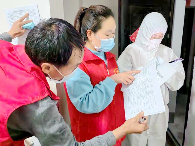 连日来,城关镇泉水社区的党员志愿者们投入抗疫一线,有序、高效地对辖区内的商户、住户等进行体温测量、“三码”核查、疫情防控政策宣传等各项工作,并督促他们做好日常防护和通风消毒工作。 (赵凤 摄)