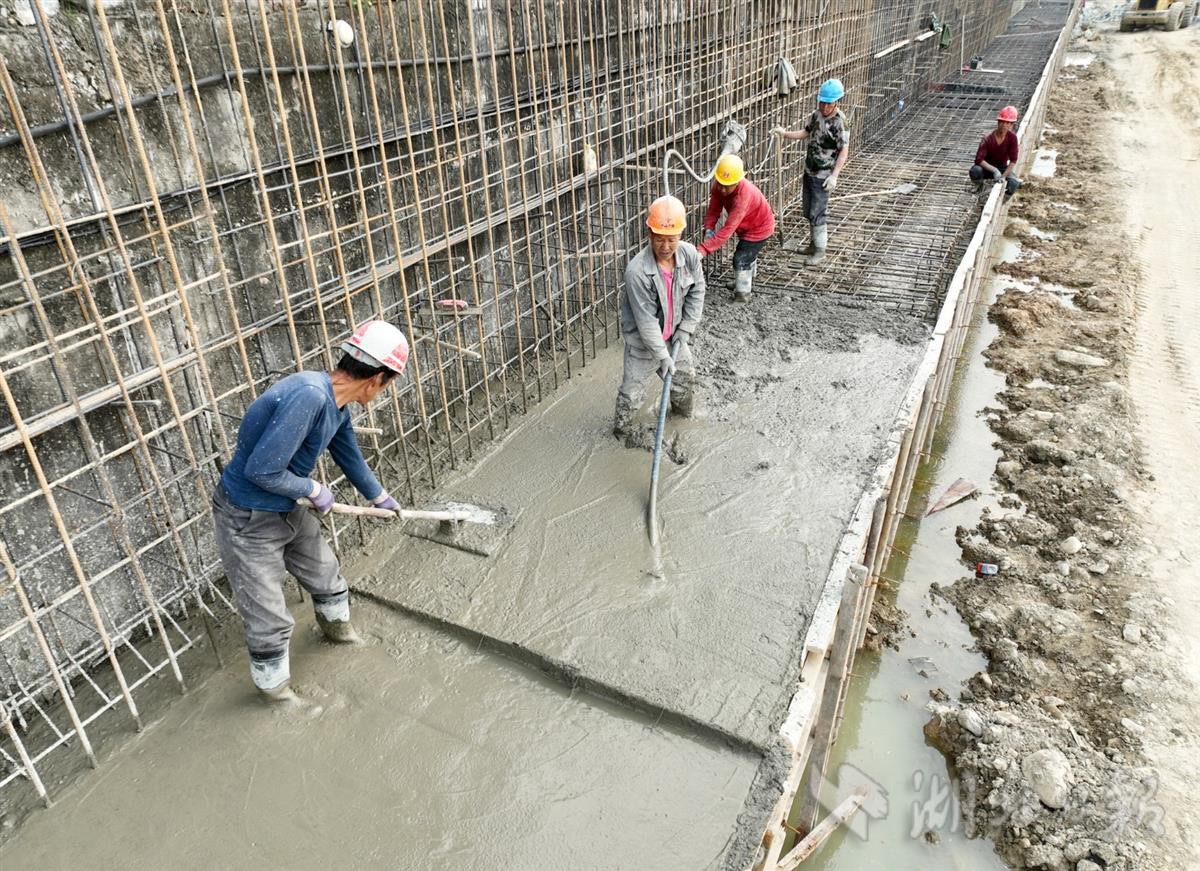 近日,房县马栏河城区孙家湾段,施工人员在浇铸钢筋混凝土河堤。我县加快除险加固“老旧”“病险”“水毁”河堤,逐一销号堤防工程安全隐患。目前,完成除险加固沙沟河、霍河、秦口河、大河等重点河流河堤,马栏河两段3000多米“老旧”工程已完工70%,剩余加固的主体工程将在主汛期前全部浚工。(张启龙 摄)