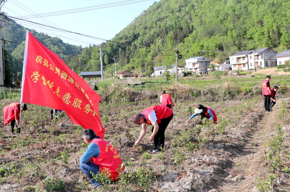 近日,窑淮镇东沟村香炉石茶叶基地,县公共资源交易中心15名志愿服务者正埋头清理田间杂草。该中心以“开展文明共建,助力乡村振兴”为主题,依托东沟村新时代文明实践站,携手开展义务劳动,将新时代文明新风吹向田间地头。(任申 朱一鸣 摄)