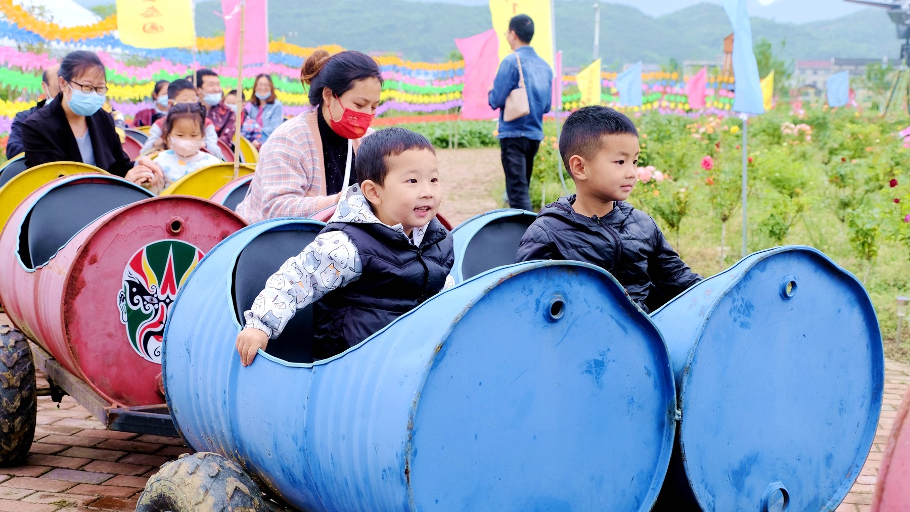 游客在军店镇向家湾村房州壹号生态园内体验网红小火车