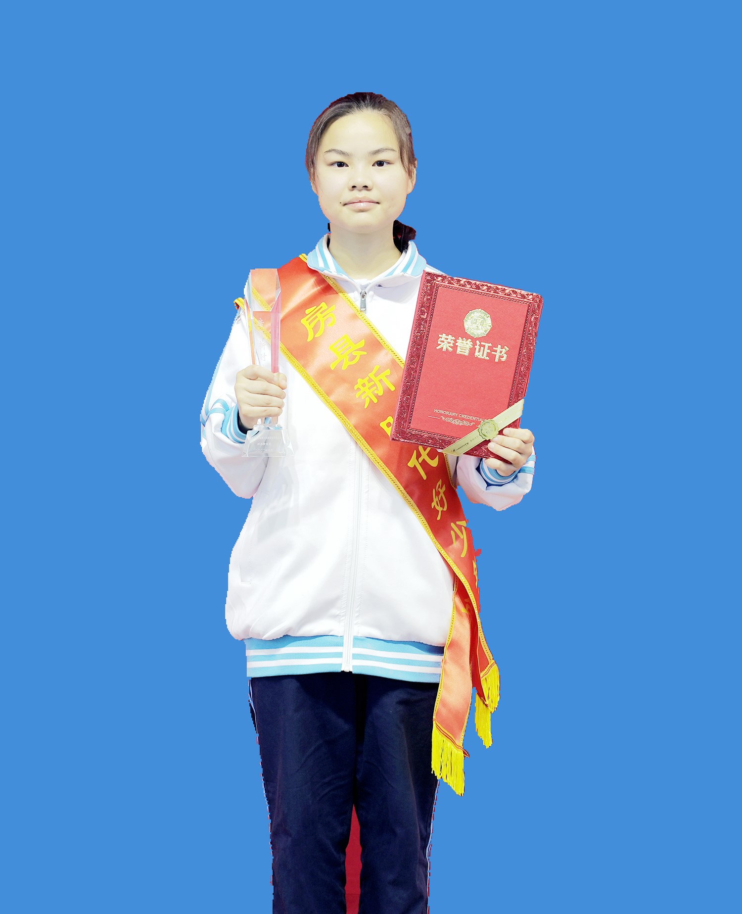 她自幼跟着爷爷奶奶生活,但始终自立自强,乐观向上,在艰苦的生活中创造精彩的人生;她乐观活泼 ,在帮助他人中不断进步;假期积极参加房县志愿者活动,为城市环境整洁作出了贡献。