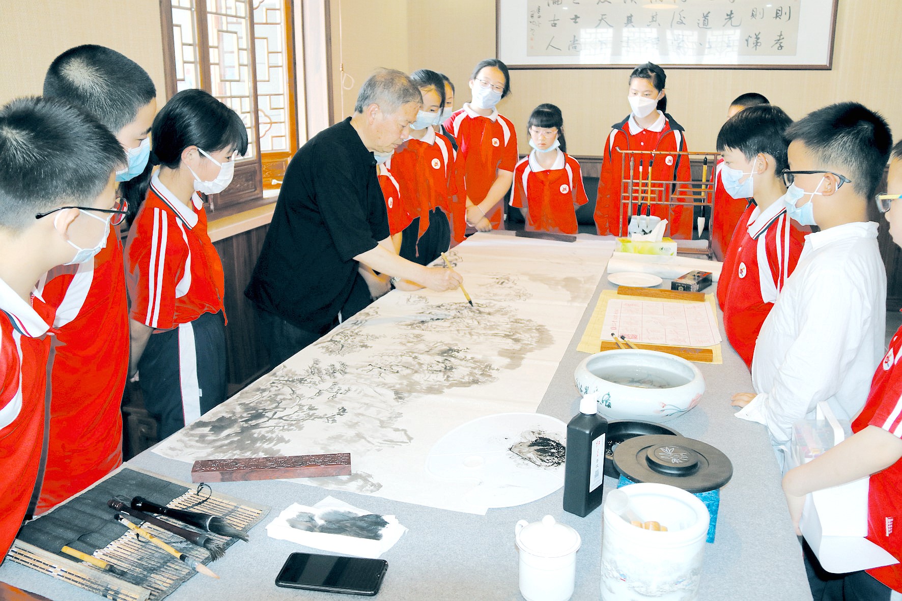 近日,县文联组织县书协、美协深入县实验小学,开展“传承弘扬经典文化助力文明城市创建”活动,文艺志愿者通过书画创作、书画指导、师生互动、赠送作品等形式,向师生宣传经典文化。(张立林 摄)