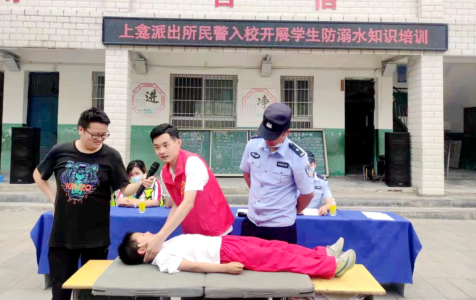 近日,上龛乡派出所民警来到上龛学校开展防溺水安全培训暨应急救援演练活动。活动中,民警围绕“防溺水安全教育知识”主题,通过互动问答、情景演练等形式,讲授预防溺水常识和落水自救、溺水救助的基本方法。(刘静 宋仕江 摄)