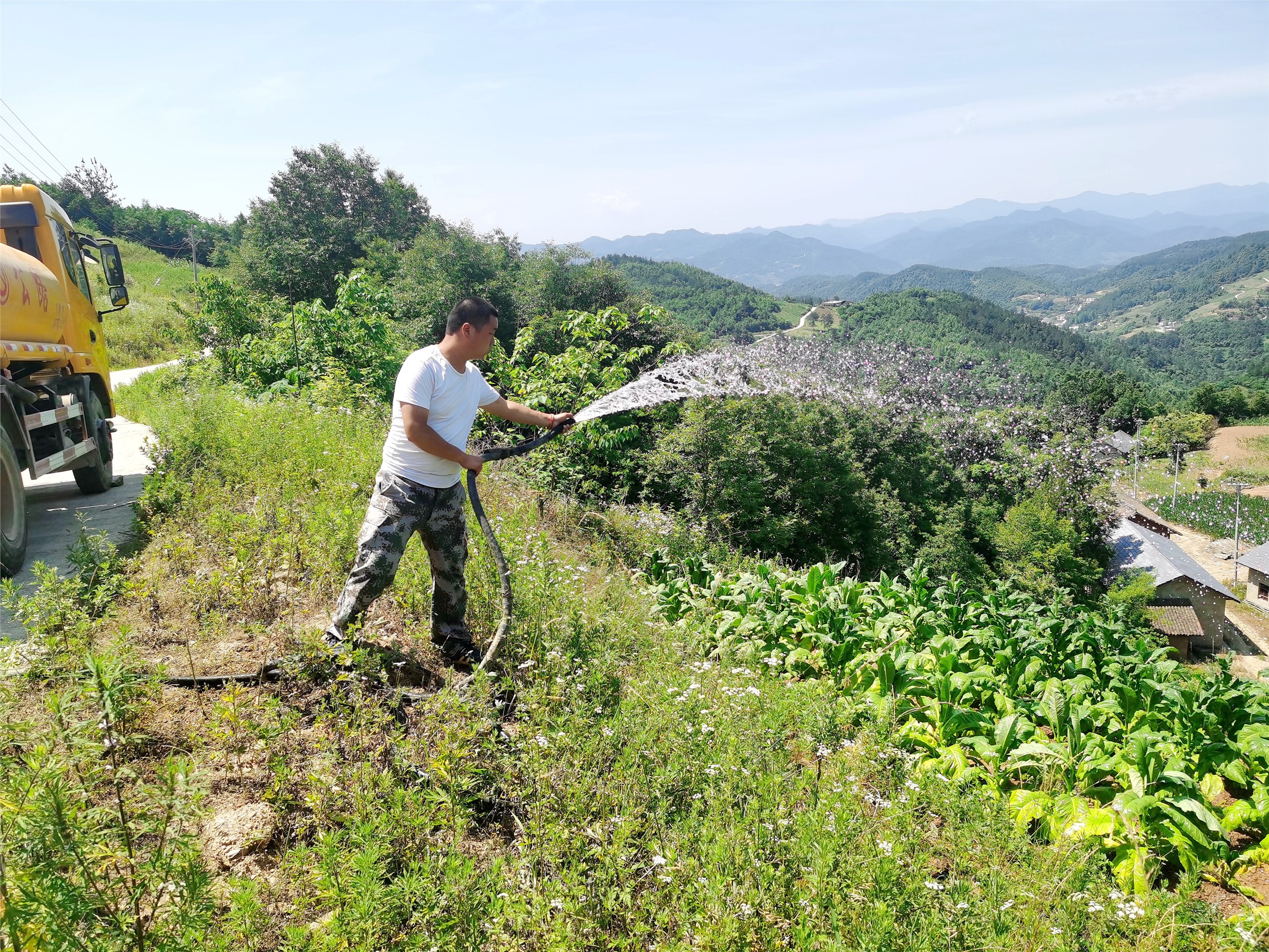 近日,房县畅顺交建集团工作人员正在用洒水车为烟苗浇水。连日来的高温少雨天气导致青峰镇冯家坡村烟苗受旱严重。在得知这一情况后,该公司立即组派洒水车到烟地进行洒水作业,为该村近7公顷的烟苗“解渴”。(刘臣 汪莹 摄)