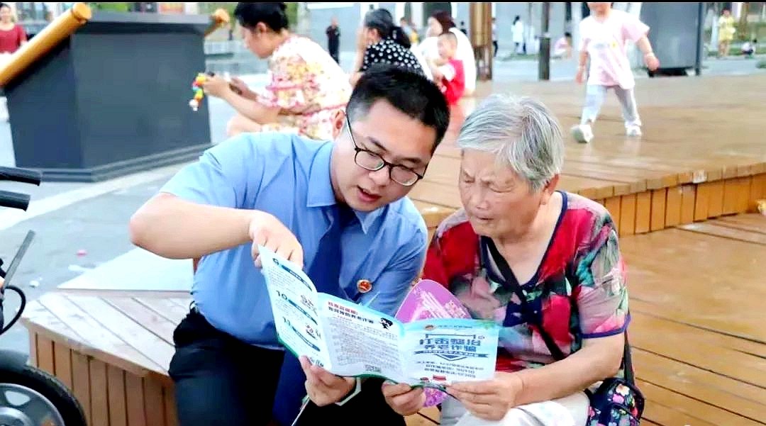 近日,县检察院干警将普法地点选在老年人跳舞的广场,为他们发放“打击整治养老诈骗”“防范化解非法集资”宣传手册,以案释法揭露“养老诈骗”“非法集资”新套路、新手段,让广大群众在休闲娱乐的同时提高法治意识。 (周青青 摄)