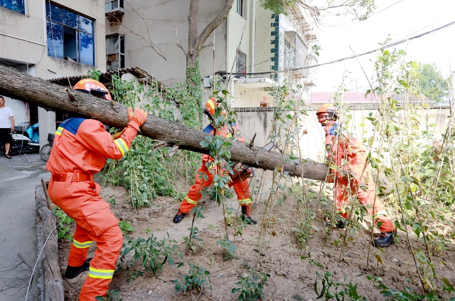本报讯 (通讯员彭磊 卢勇) 近日,城关镇神农路某居民院子里有一棵干枯大树被大风刮断,直接压在一民房外墙上,存在极大的安全隐患,县消防救援大队接到群众报警后,迅速行动,帮群众排忧解难。