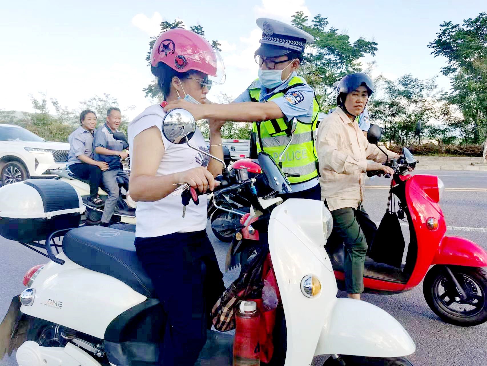 近日,县交警大队执勤辅警在北城工业园区附近为骑乘市民正确佩戴头盔。在“平安头盔”百日专项行动中,县交警大队通过巡逻管控、集中统一行动等形式,重点查纠摩托车、电动自行车骑乘人员未佩戴安全头盔、非法安装遮阳伞(棚)、逆行、闯信号灯等交通违法行为,并向不佩戴安全头盔的市民进行安全教育,讲解“一盔一带”出行常识,引导他们文明有序出行。(孙国 胡彬 摄)