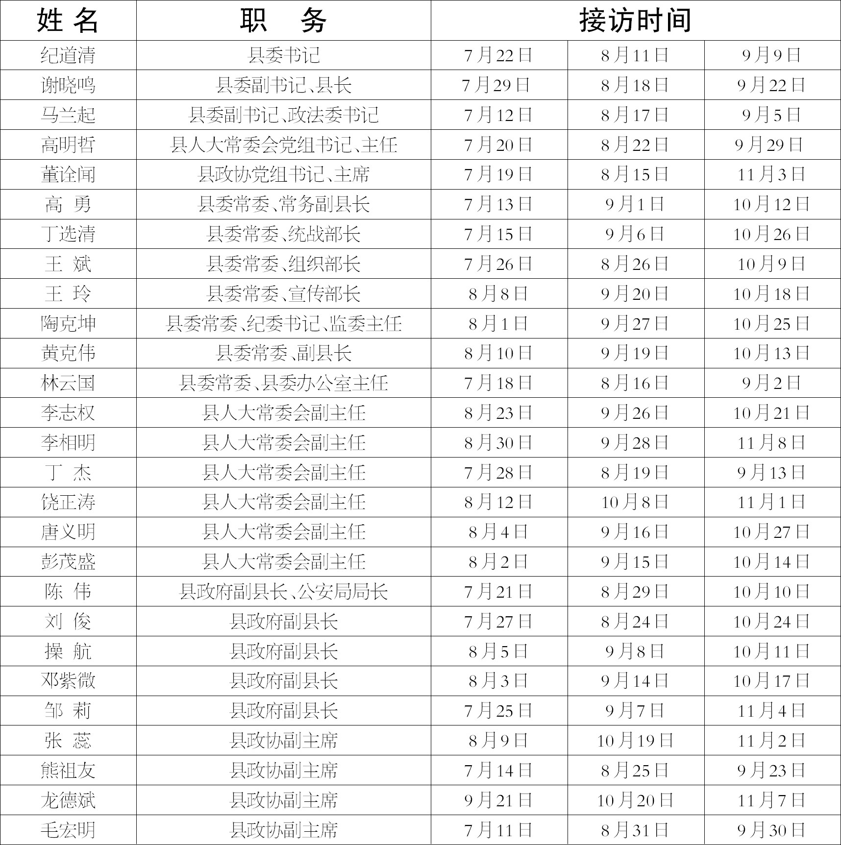 为进一步畅通信访渠道,发挥了解民情、维护民利的作用,经县委、县政府研究同意,县四家班子领导工作日轮流在县社会治理中心坐班接待群众,现将接访时间安排公开如下: