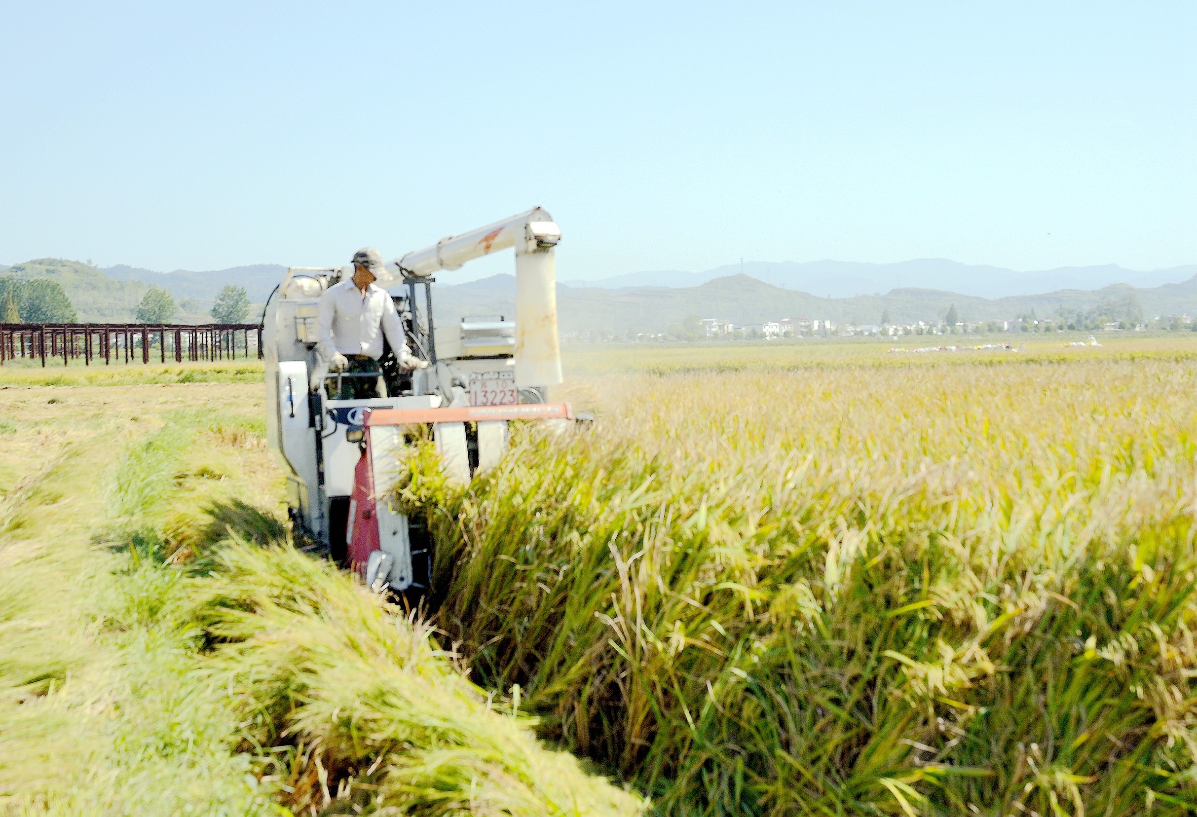 近日,在军店镇军马水稻主产区,当地村民正抢抓晴好天气驾驶农机收割水稻。近年来,军店镇大力推广机械化种植,探索出育秧、插秧、无人机植保、收割、烘干“一站式”机械种收模式,真正让农民既省心又增收。 (陈锐 摄)