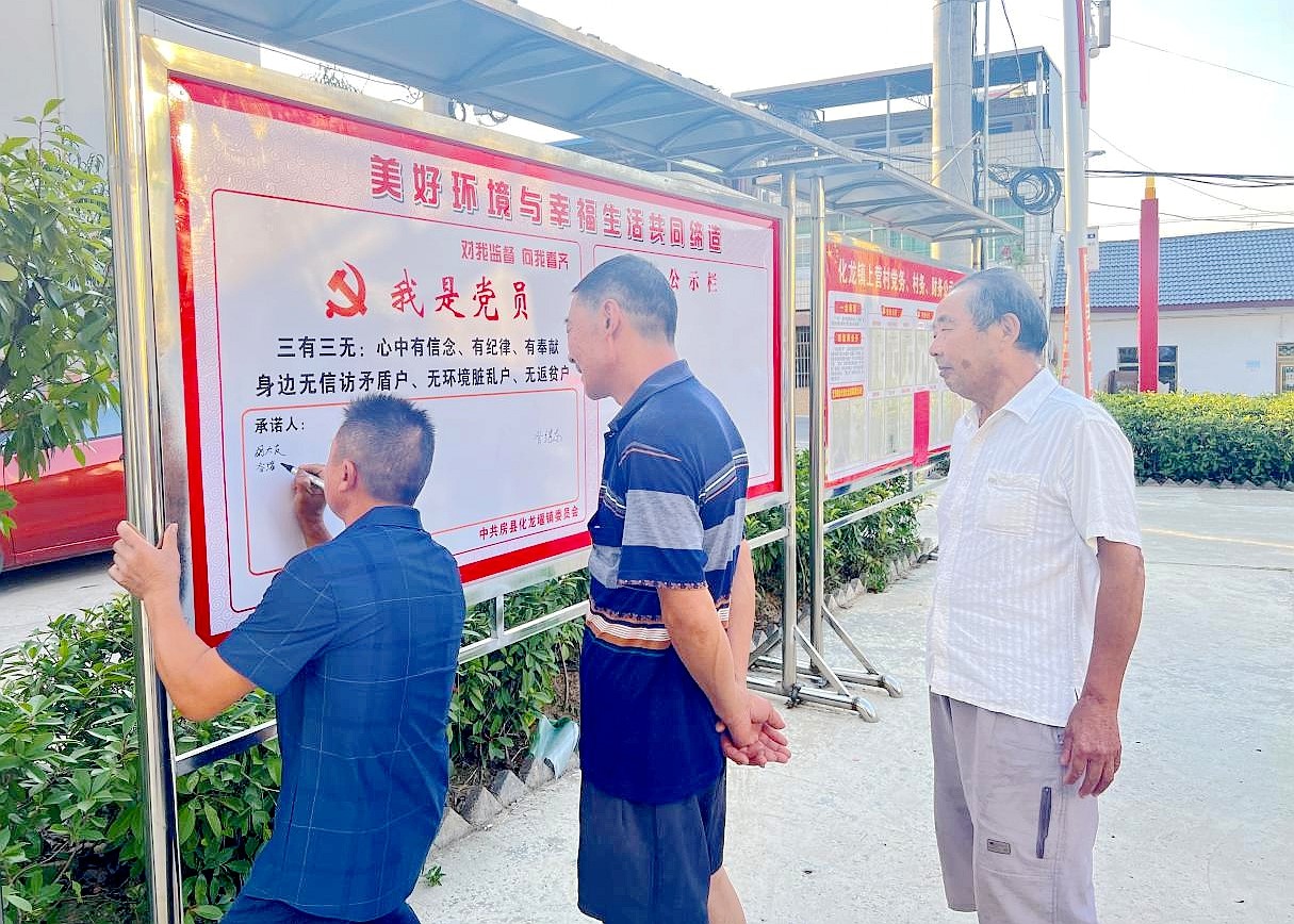 近日,化龙堰镇组织党员在“三有三无”承诺板上签字。今年以来,该镇坚持党建引领,以开展“党员有信念、有纪律、有奉献,党员身边无信访矛盾户、无环境脏乱户、无返贫户”的“三有三无”活动为突破口,凝聚党员力量、发挥党员能量,引导广大群众参与美好环境与幸福生活共同缔造活动。