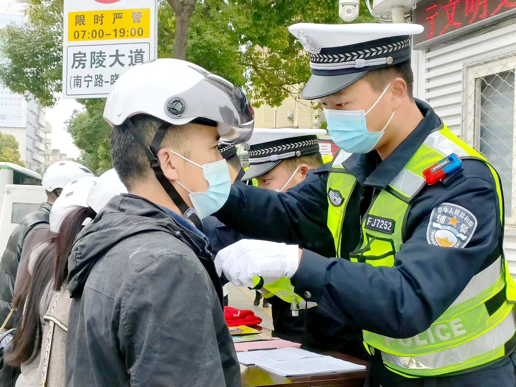 11月15日,交警在水蓝郡执勤岗亭开展“平安头盔”交通安全宣传教育活动,对自觉接受教育的驾驶人送上“平安头盔”,并现场宣传文明交通法规。此次活动,共送出“平安头盔”20余个,签订文明交通实践承诺书50余份。(刘晶晶 胡彬 摄)