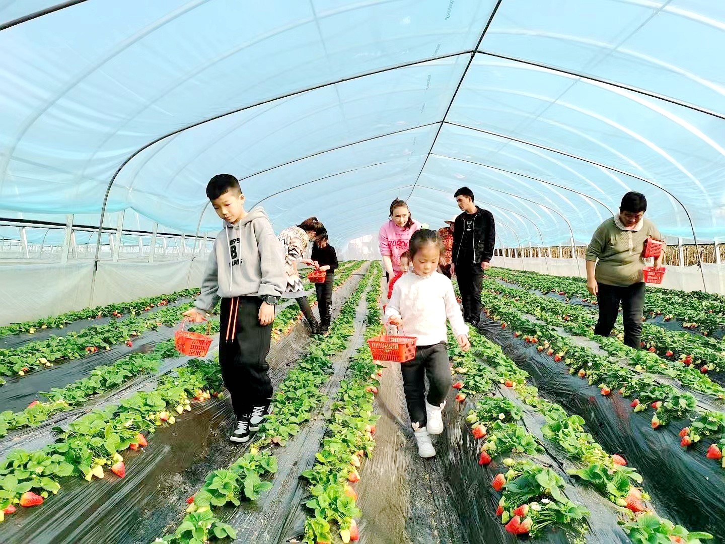 近日,在军店镇月明村草莓采摘园,游客们提着篮子享受采摘的乐趣;村民们忙着采摘、装箱、外运新鲜的草莓,园内园外一派繁忙 。今年来,军店镇大力发展草莓、火龙果、蓝莓、冬桃等特色现代农业,打造休闲、观光、采摘一体的“近郊游”模式,实现群众增收和草莓园增效“双赢”。 (谢鸽 摄)