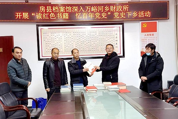 近日,县档案馆到万峪河乡财政所开展“读红色书籍 忆百年党史”送党史下乡活 动。活动中,县档案馆现场向该财政所捐赠上百册图书,进一步激发干部职工读党史、学党史的热情,对“书香财政”建设,营造全民阅读、终身学习的良好氛围。(秦家林 摄)