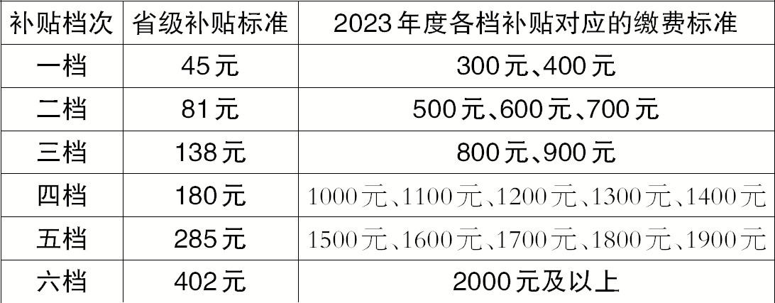 省级确定的缴费补贴标准分六档:一档45元,二档81元,三档138元,四档180元,五档285元,六档402元,各档补贴对应的缴费标准将跟随缴费区间的变化动态调整,由省人力资源和社会保障厅、省财政厅适时公布。2023年度省级确定的缴费补贴对应的缴费标准分别为:一档补贴对应缴费标准为300元、400元,二档补贴对应缴费标准为500元、600元、700元,三档补贴对应缴费标准为800元、900元,四档补贴对应缴费标准为1000元、1100元、1200元、1300元、1400元,五档补贴对应缴费标准为1500元、1600元、1700元、1800元、1900元,六档补贴对应缴费标准为2000元及以上。