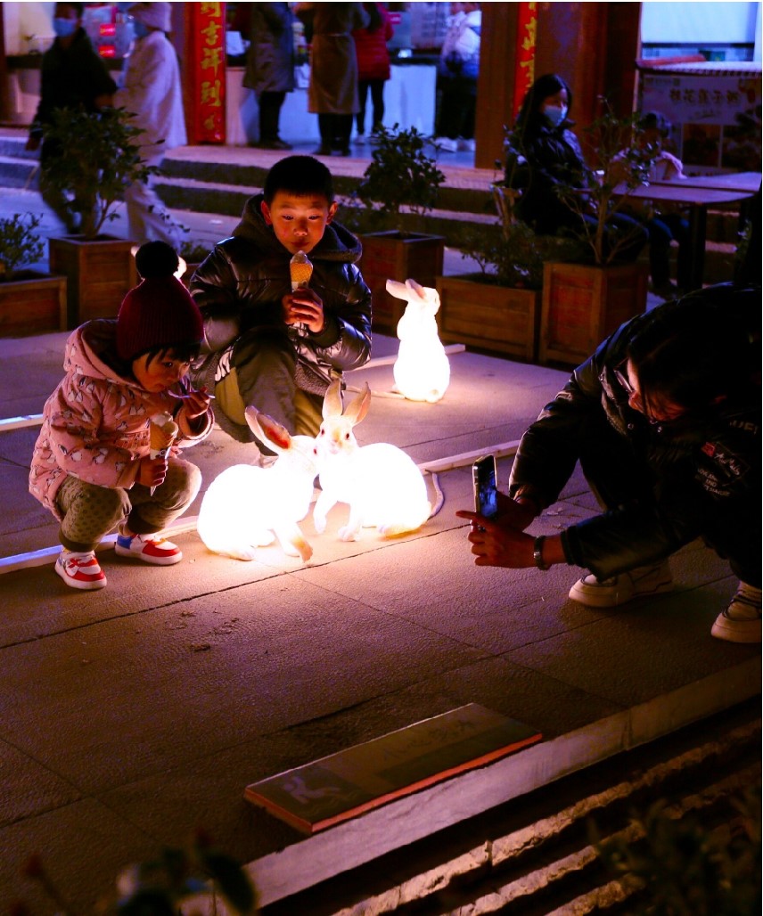 游客在兔子灯前拍照留念。(朱爱东 摄)