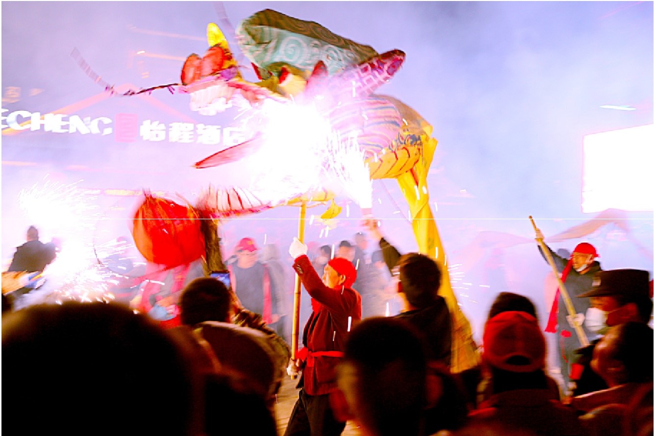 2月4日晚8点,两条长达40米的“火龙”在西关印象景区游腾舞动。30多名舞龙者举着火龙健步如飞,威武的龙头上下来回旋转,长长的龙节跟随舞动,展现出龙的精气神韵和房县人不畏艰险、勇敢前行的精神。现场的大人小孩围抢着用“花子”焰火喷射新一年吉祥火花,不时还有人穿越火龙,以龙气驱邪气,祈福新一年的美好生活。