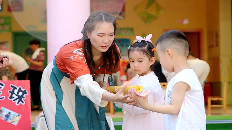 县幼儿园中班组举行庆“六一”亲子游园活动。活动中,家长和孩子们通过抬花轿、戏龙珠、投壶、汉服秀等传统游戏及团扇妙染、额间花钿、捏泥人等亲子手工,享受亲子陪伴的幸福时光。 (黄玉丽 摄)