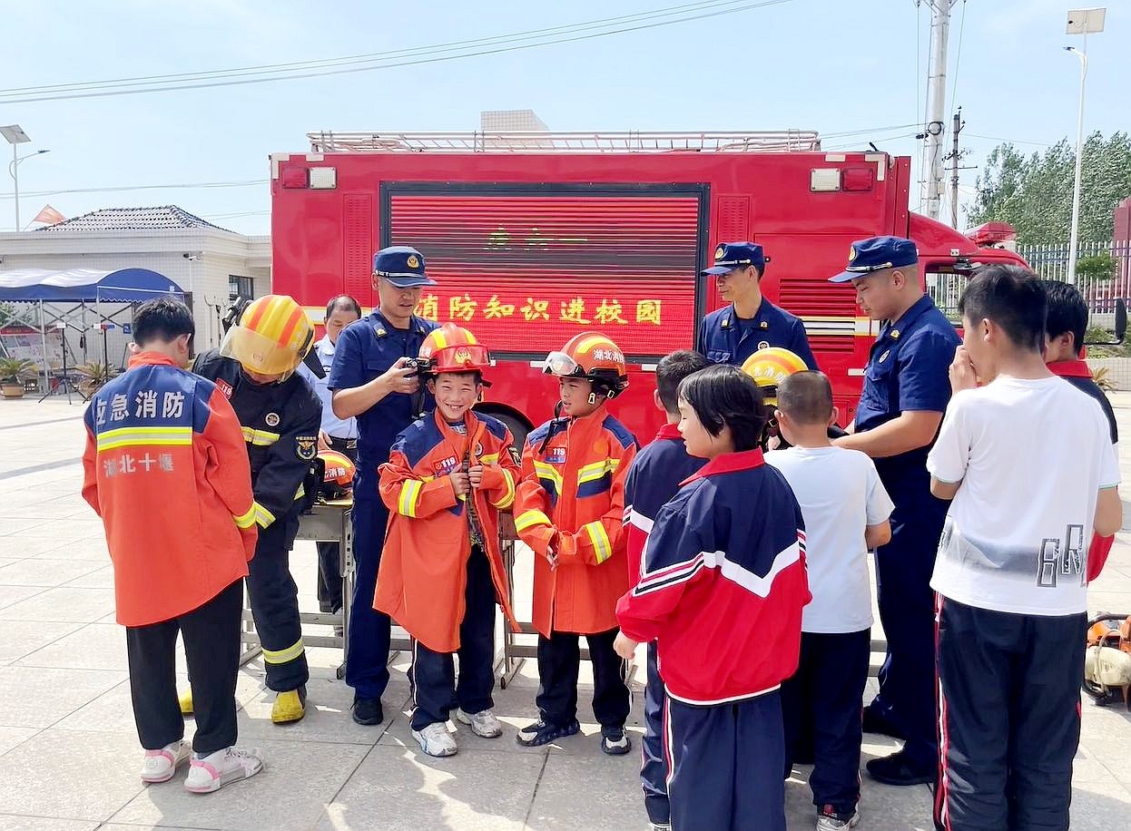 5月31日,县消防员正在为红塔镇谢湾小学的学生穿戴防护服。在消防知识宣传进校园活动中,消防员从火灾的危险性、校园常见的火灾类型、如何逃生自救、消防器材使用方法等方面进行讲解,增强学生消防安全意识和自防自救能力,营造良好的消防安全环境。