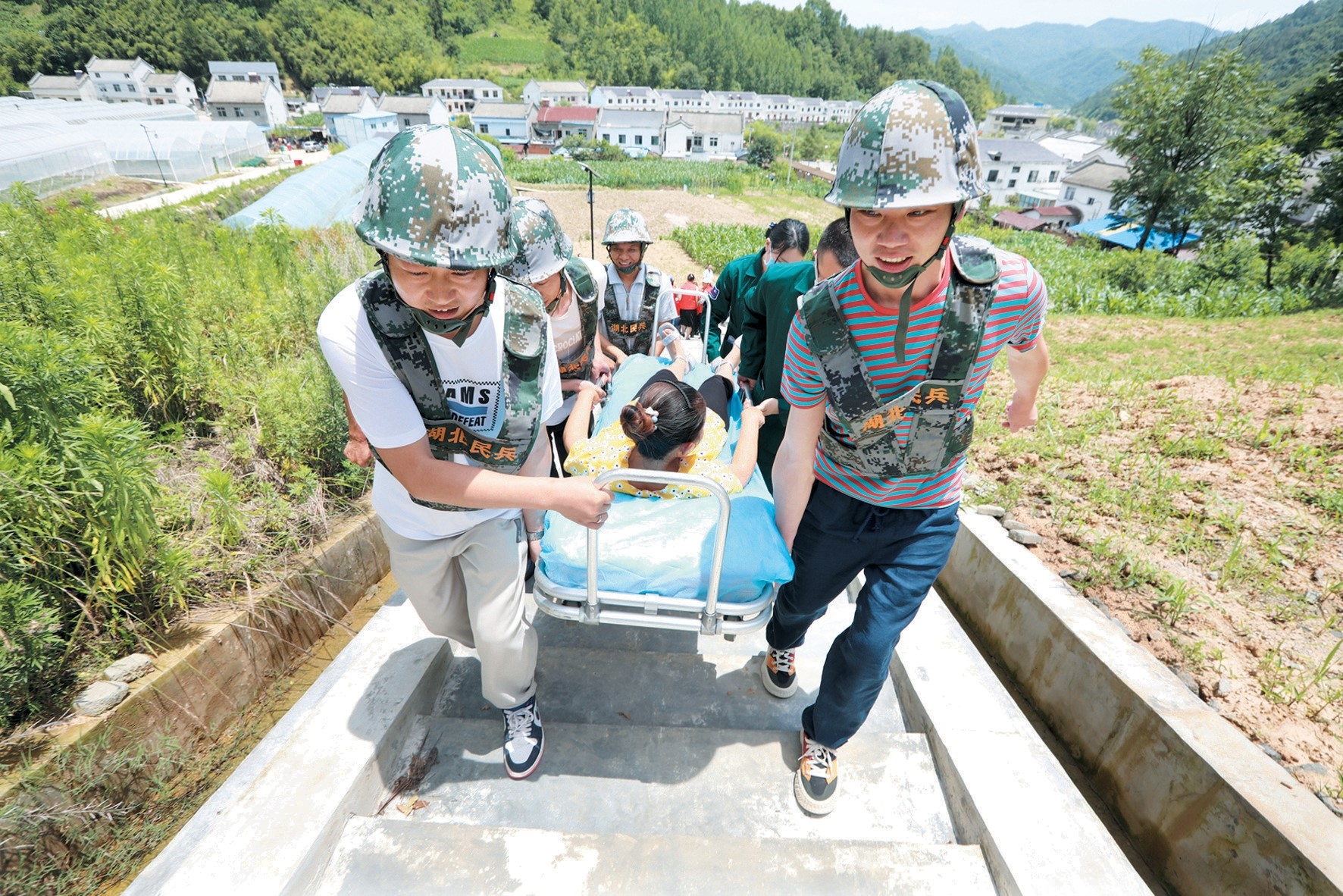 近日,在窑淮镇防汛抢险应急演练活动中,救援队员正协力转移群众、抢救“伤员”。通过演练,进一步锤炼防汛抢险救援队伍,提高应急处置水平,提升干部群众风险防范意识,为防汛抢险打下坚实基础。 (张启龙 摄)