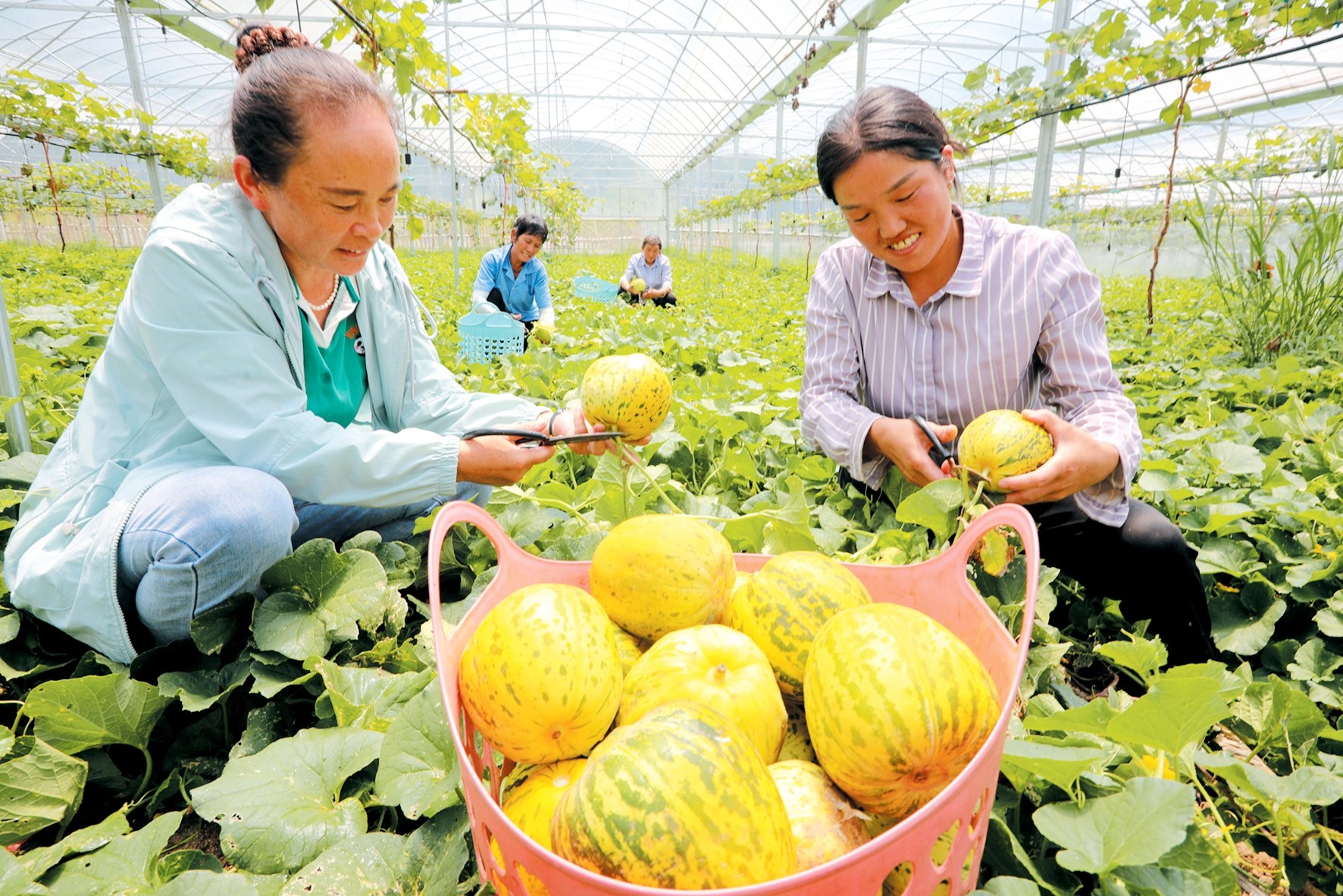 近日,窑淮镇陈家铺村清洁小流域智慧果园产业基地,农民正在采摘“糖薄虎”甜瓜。近年来,我县全域推行畜禽肥、花生与油菜籽饼肥、焖制土粪肥等有机肥料,发展生态西瓜、甜瓜、葡萄、鲜桃等瓜果产业,带动乡村产业发展,促进农民就地就业和增收。目前,我县各类瓜果陆续成熟上市,滋润农民幸福甜美生活。 (张启龙 摄)