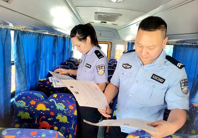 近日,县车管所开展校车安全大检查行动,把好校车“安全关”。民辅警重点检查校车轮胎、安全带、灭火器、急救箱、安全手锤、安全出口等设施是否符合安全标准;审核驾驶人驾驶资质、违法记分情况,签订安全承诺书;要求校方详细掌握校车驾驶人、运行时间、运营路线等信息,确保校车安全运行。(黄小雪 摄)