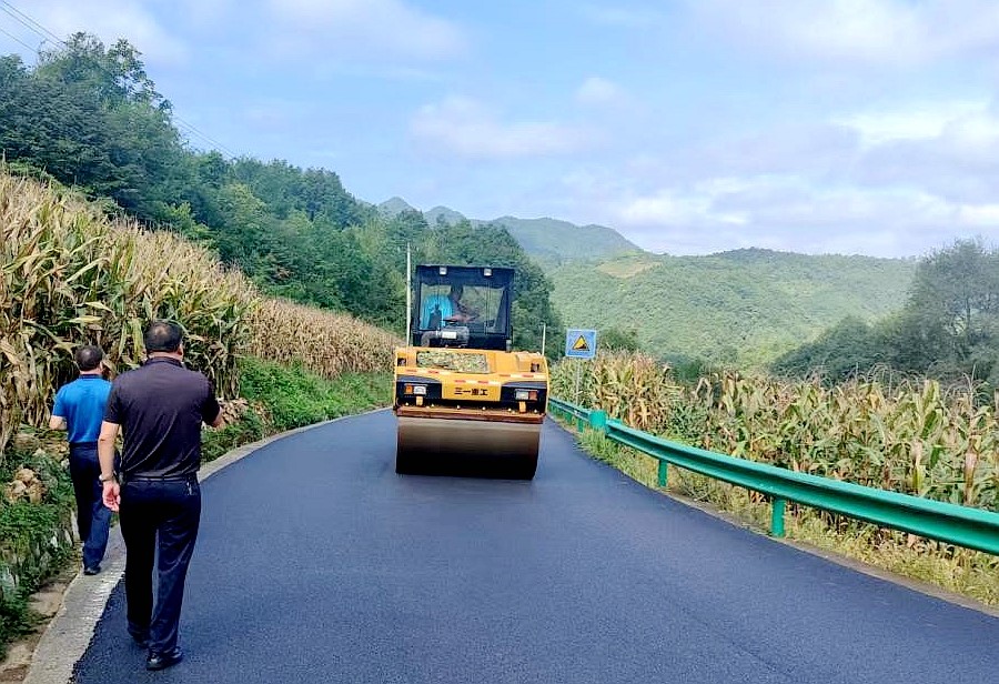 近日,在回龙乡黑獐沟村,滚烫的沥青混合料从铺路机上均匀地洒出,压路机在刚铺好的沥青路面上来回碾压,路面黑化项目正有序实施。今年该乡启动4条产业路、提档升级路、安保路,满足居民出行需求,助力提升乡镇形象、人居环境。