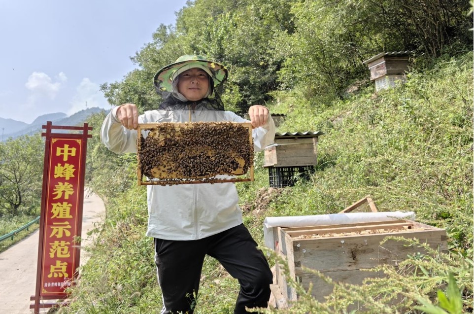 近日,在青峰镇上阳坪村中蜂养殖示范点,养蜂人王超正戴着防护帽收割蜂蜜。该村积极发展特色养殖产业,发挥本地养蜂大户、养蜂能手的‘传帮带’作用,通过能人带头、组织开展技术培训、外出考察等方式,提高蜂农的养蜂水平。