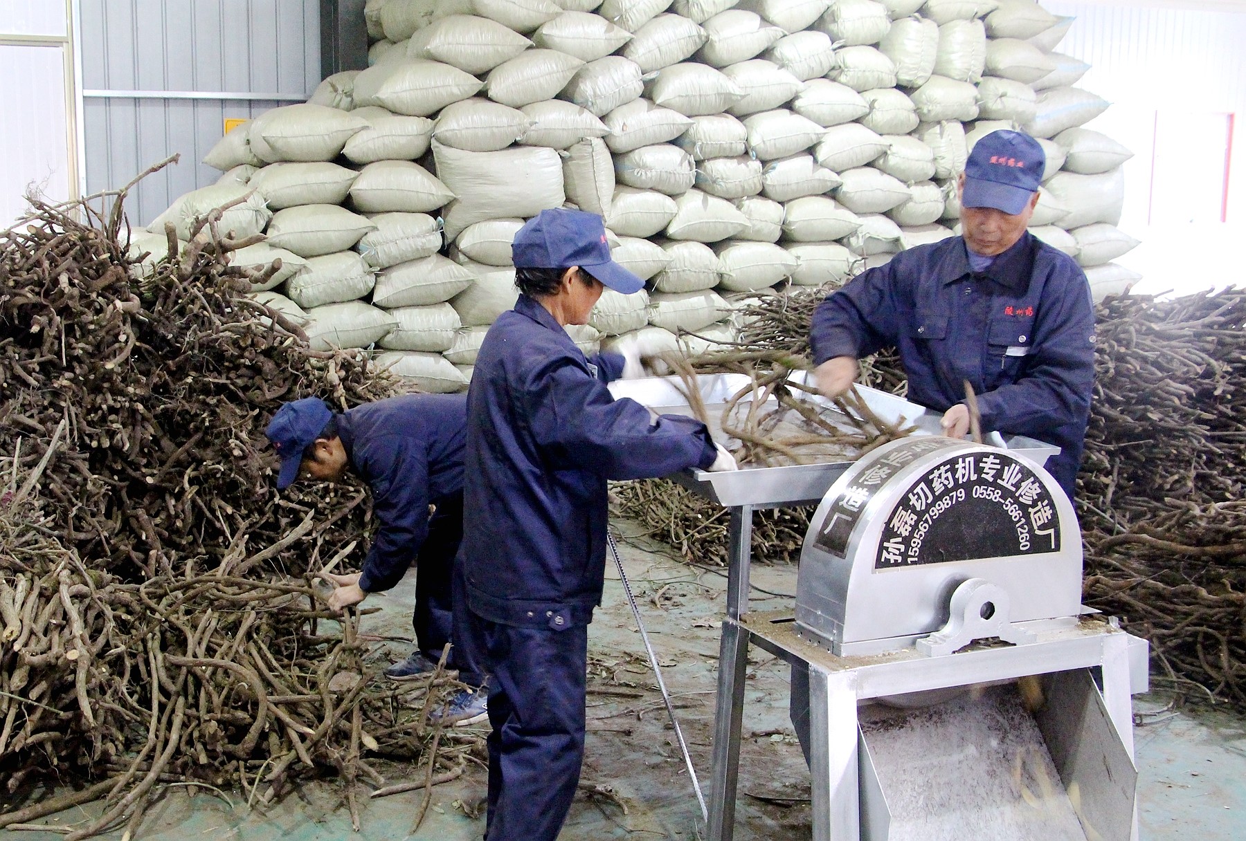 近日,在门古寺镇狮子岩药材初加工车间,工人正忙着把药材送进机器进行切片、装袋,整个过程井然有序。该车间主要从事中草药材脱皮,烘干,切片等,为门古寺镇中药材产业延链补链、产业升级提供新路子,拓宽了农民增收致富渠道。(许诺君 徐鹏飞 摄)