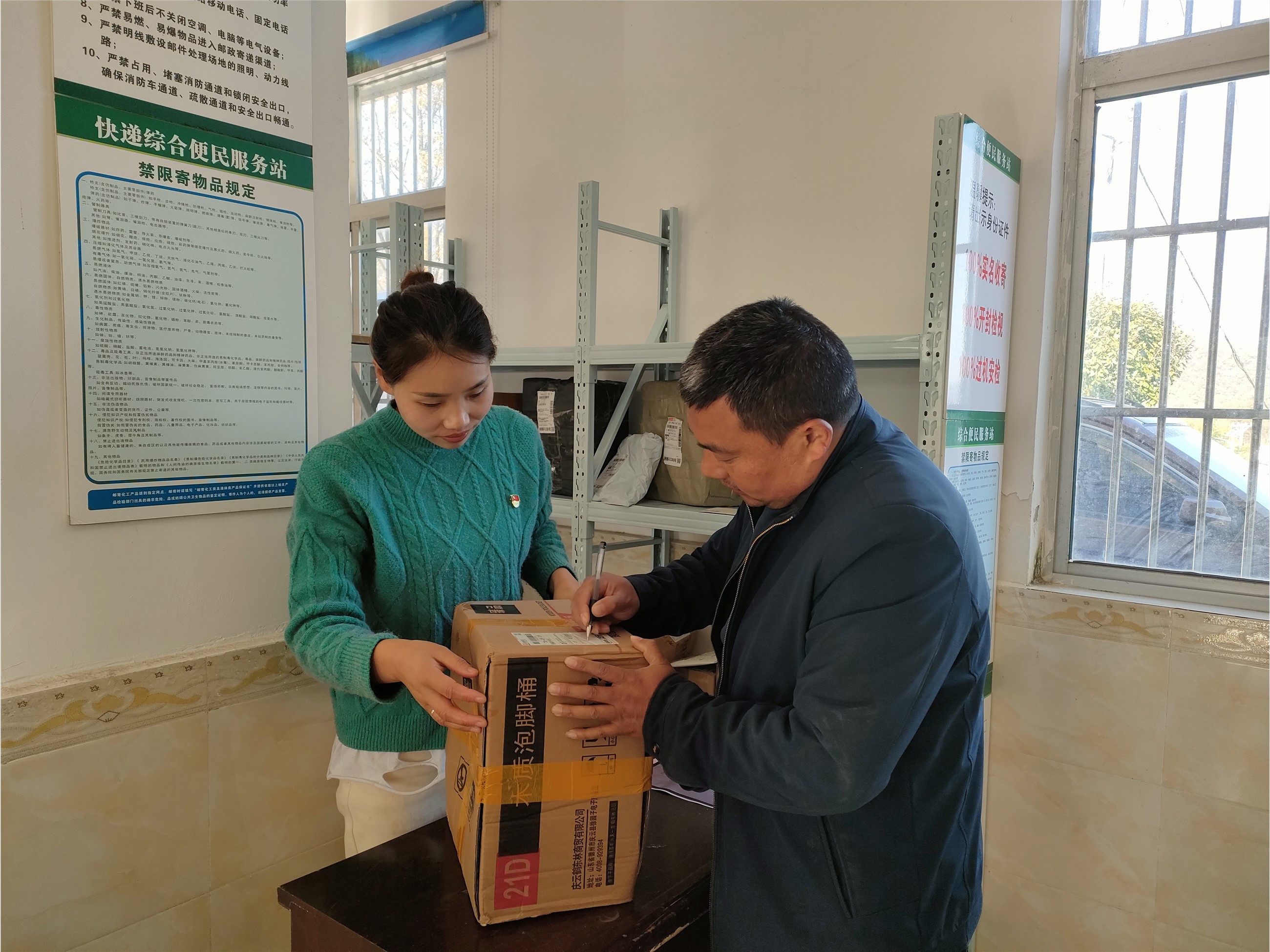 11月26日,在沙河乡朱家坪村快递点,村干部化身快递员为村民发放快递。该乡建立“寄递物流综合便民服务站”12个,成立“快递上门小分队”10支,惠及周边群众4000余人。(桂培培 摄)