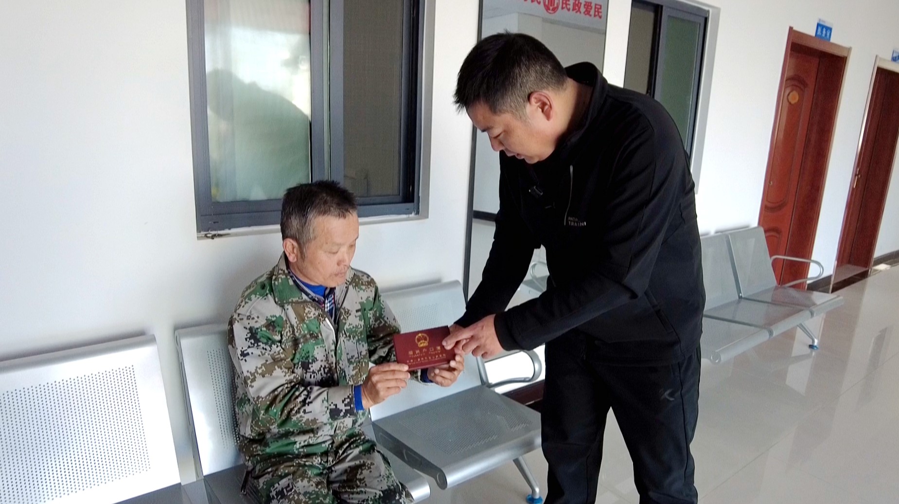 近日,在县救助管理站,工作人员将户口本交给流浪人员。今年以来,城关镇便民服务中心公安户籍窗口和县民政部门协同办公,为4名符合条件的流浪乞讨人员办理了落户手续,以优质高效的服务落实“民有所盼,政有所为”的目标。 (曹其琪 摄)
