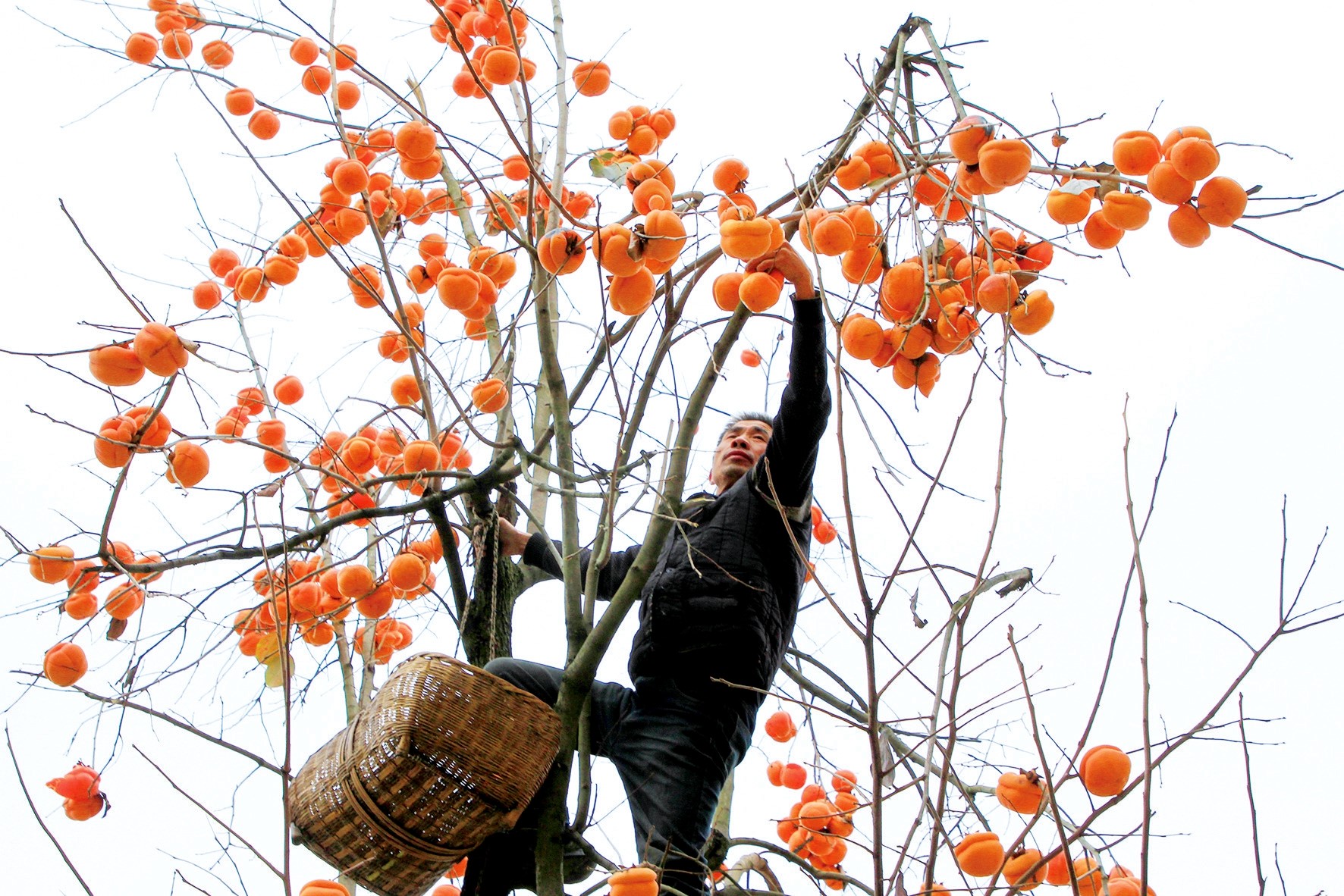 近日,军店镇下店子村农民在自家庭院采收红彤彤的柿子。近年来,我县引导村民利用房前屋后闲置空地栽植果树,发展庭院经济,美化庭院环境。如今,一个个“闲置”的小庭院成为农户增收的“新引擎”。 (张启龙 摄)