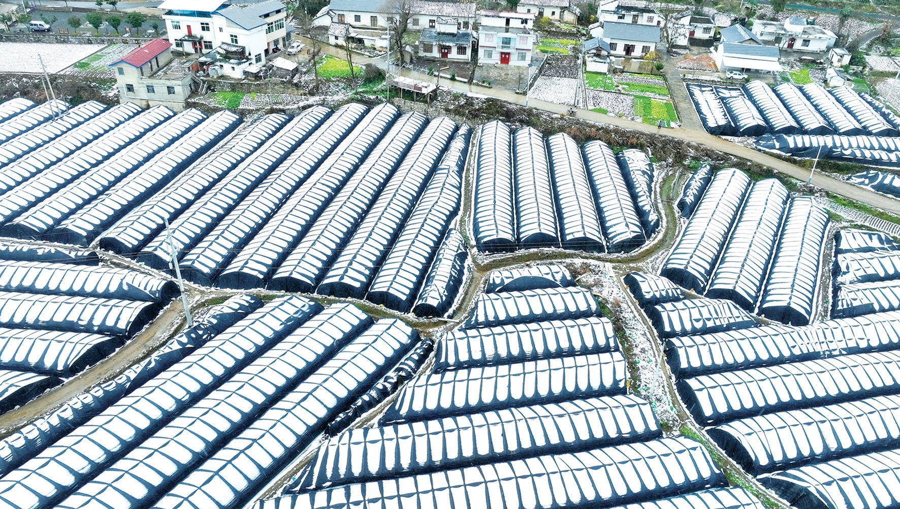 近日,在城关镇白土村羊肚菌产业基地,连片的防冻保温大棚被冰雪覆盖,大棚内的羊肚菌在“保暖房”里享受着适宜的生长温度。入冬以来,我县利用冬闲田大规模种植羊肚菌,同步为羊肚菌搭建越冬保温大棚,加盖“保温被”,预防雨雪冰冻天气导致羊肚菌冻伤,确保羊肚菌丰产丰收。 (张启龙 摄)