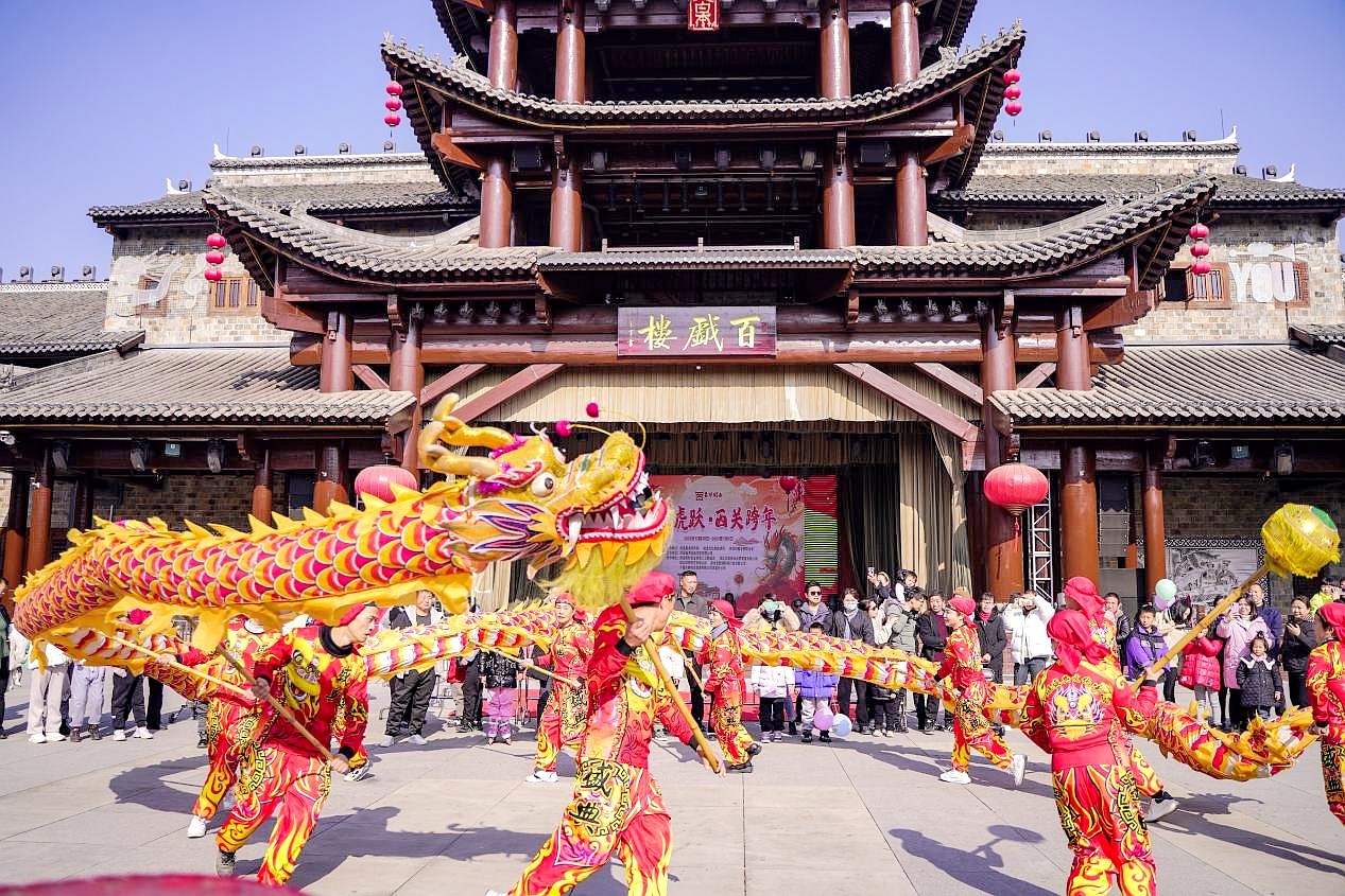 在西关印象景区,数万人齐聚百戏楼前观看热闹欢腾的舞龙舞狮表演,现场游客不禁跟着舞龙舞狮队伍欢呼跳跃,祈福纳吉;夜幕降临,周南广场千年非遗打铁花酷炫来袭,声势震撼,绚丽至极,令人叹为观止的同时也为人们的生活带去无限的欢乐和希望;晚上八点,“龙腾虎跃西关跨年”主题晚会节目精彩纷呈。灯光秀、古风舞蹈、各式互动小节目以及沉浸式喜剧等群众喜闻乐见的表演,让现场观众欢喜不已,发出阵阵喝彩声。
