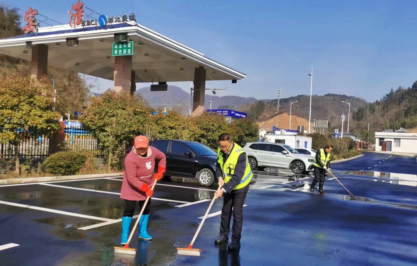 近日,湖北交投鄂西北运营公司窑淮管理所组织收费站工作人员对安全岛、收费车道、费亭、便民服务亭等区域进行清理,完善便民服务亭物资配置,为广大司乘朋友营造干净整洁的高速通行环境。(贺永 摄)