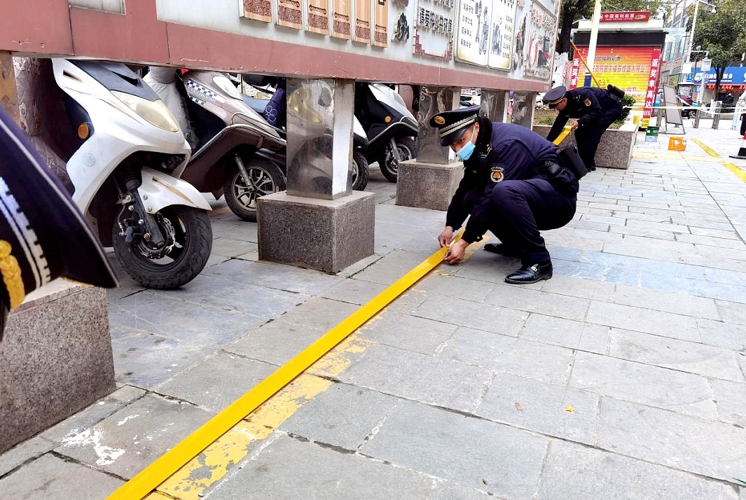 近日,县城管执法局队员对非机动车车位标线脱落、模糊不清的区域进行补划更新“上新妆”。目前,已完成天一路约1500米,步行街约1700米,老十字街便民市场外55米非机动车停车黄线。(刘润松 戢薇 摄)